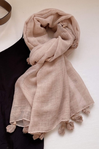 Delikatny szal w kolorze pudrowego różu, ozdobiony frędzlami. Wymiary 180x90 cm. Skład: 80% bawełna, 20% poliester.