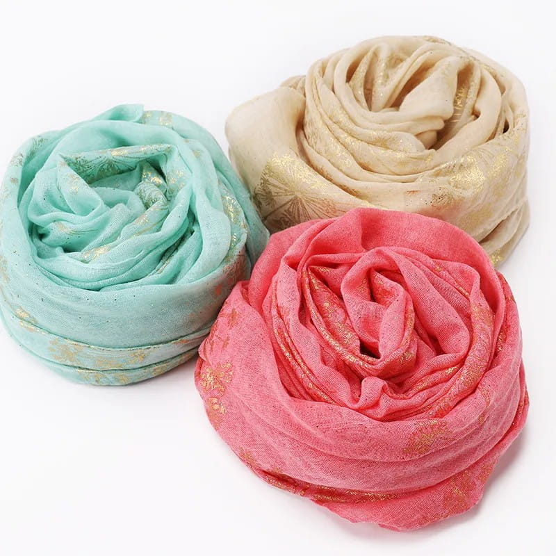 SZAL 180x70cm Golden Flower chusta na głowę hidżab zdobiony złotymi kwiatami w kolorze lila
