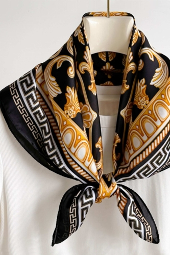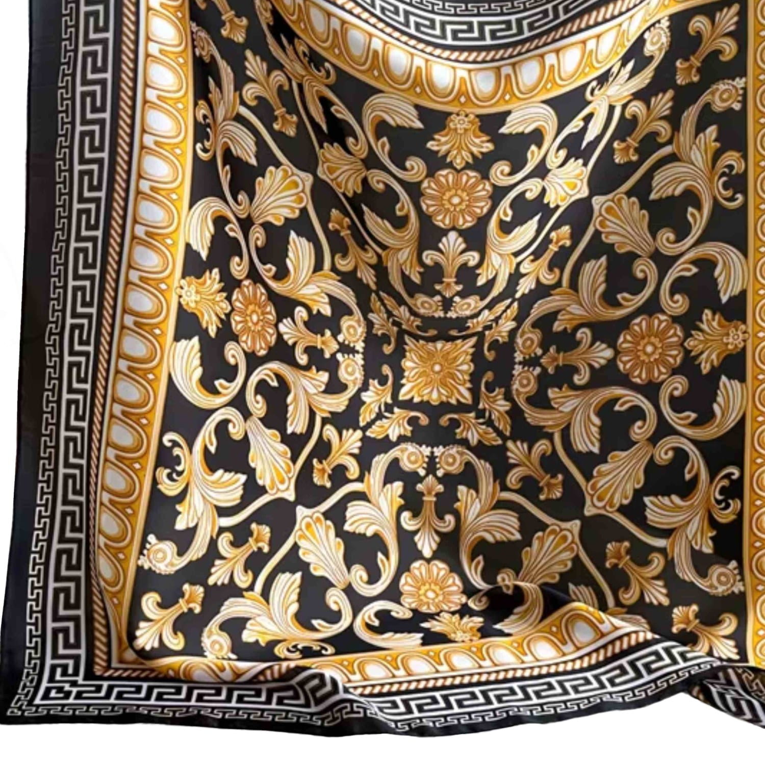Satynowa apaszka 70x70 cm w czerni i złocie z ornamentem barokowym – elegancja, która podkreśli Twój styl.