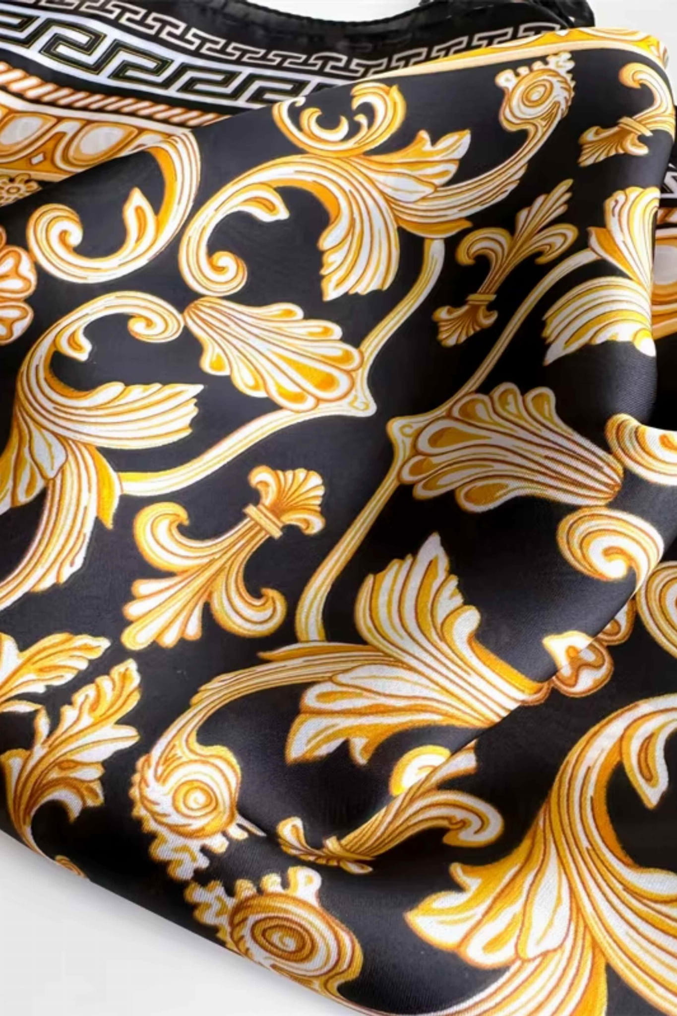 Ta apaszka to wyraz luksusu i ponadczasowej klasy. Na głębokim, czarnym tle rozpościera się złoty, barokowy ornament florystyczny, który otacza środek niczym królewska ramka. Delikatny połysk tkaniny podkreśla detale, a grecki wzór wzdłuż krawędzi dopełnia całości w stylu glamour.