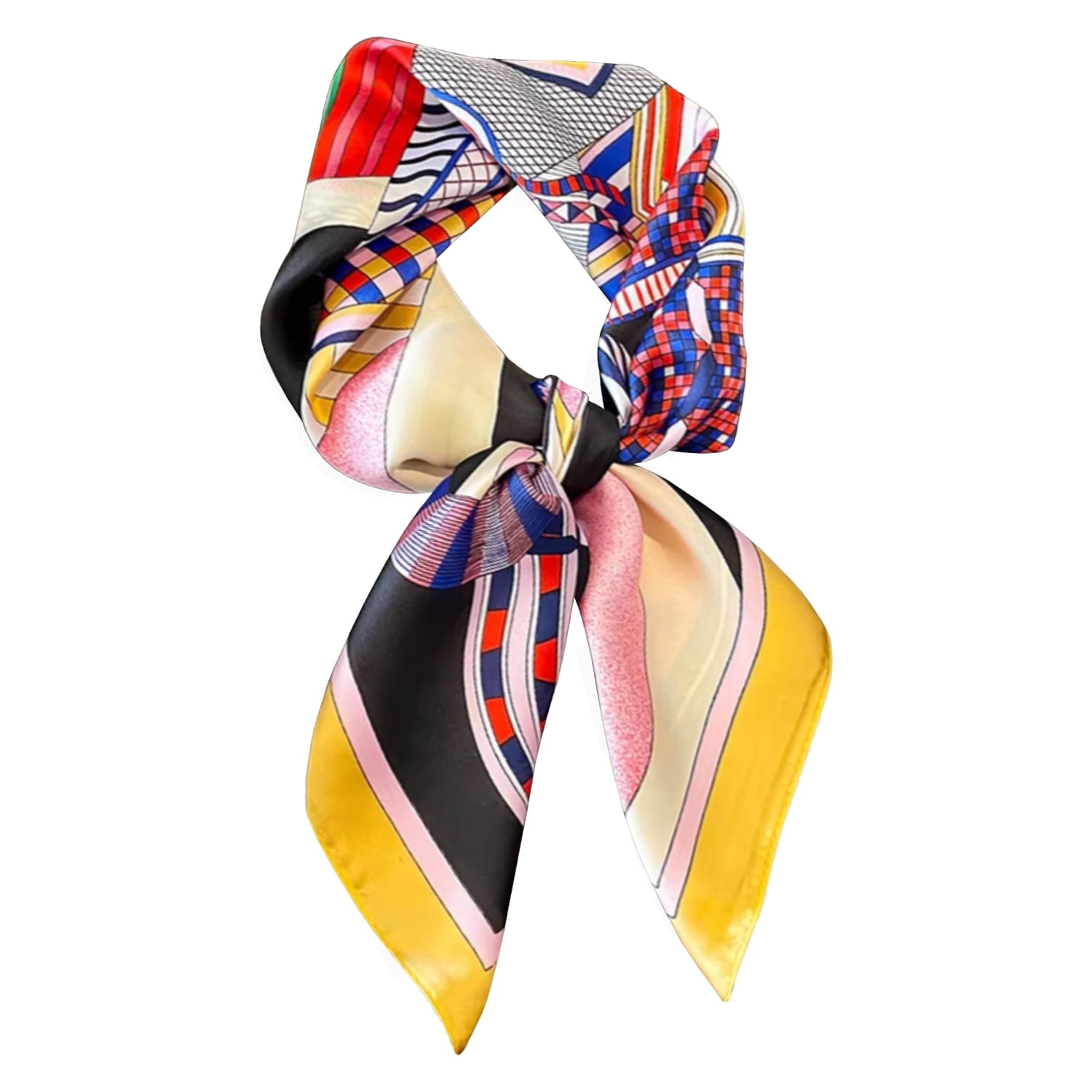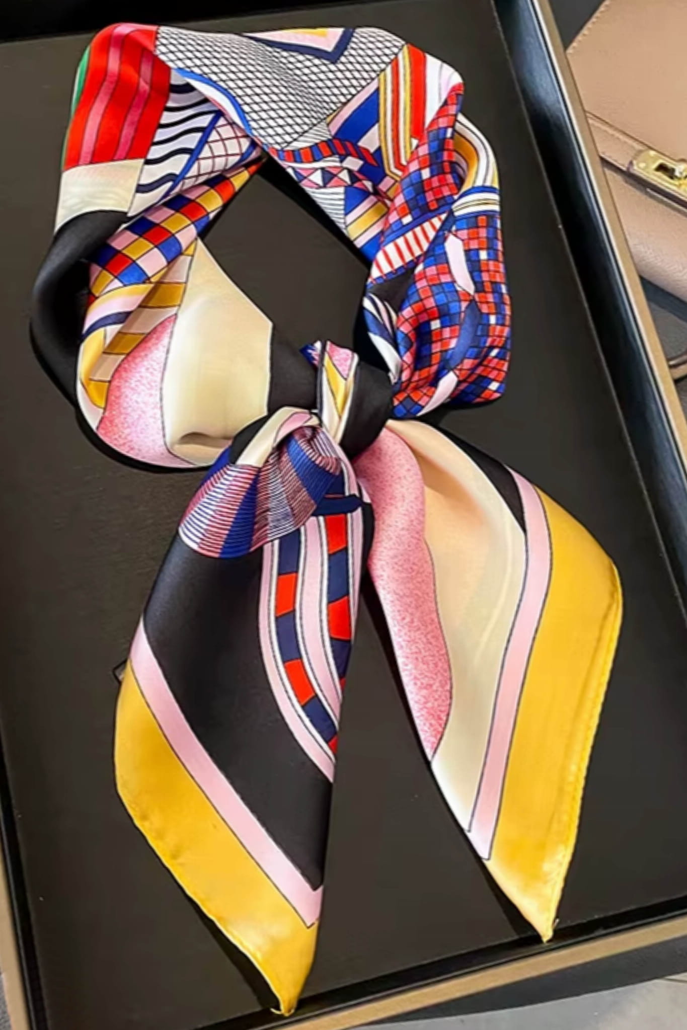 Satynowa apaszka damska – barwna geometria z nutą jeździeckiego stylu