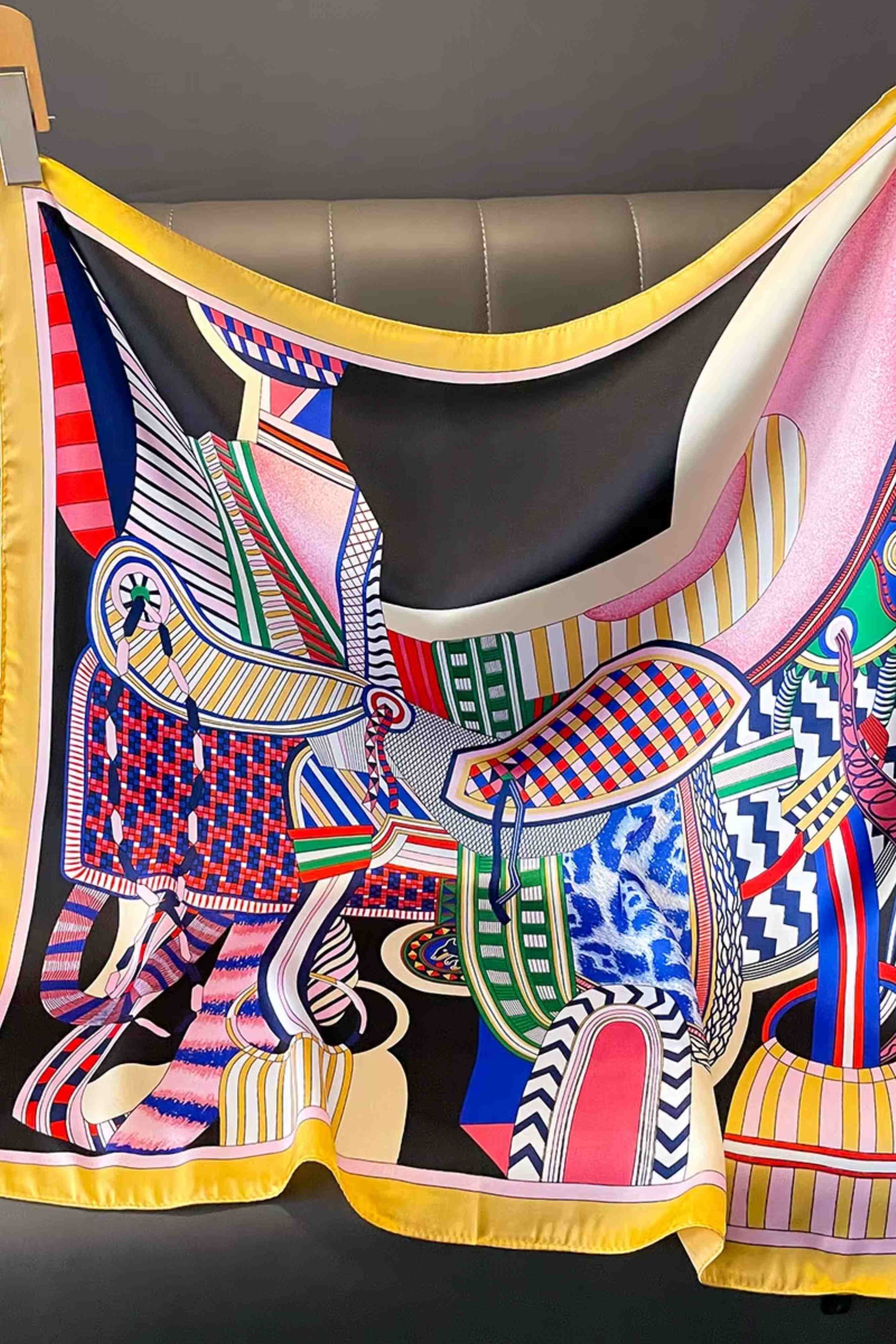Satynowa apaszka 70x70 cm z barwnym motywem inspirowanym siodłami – stylowa i pełna energii z żółtą ramką.