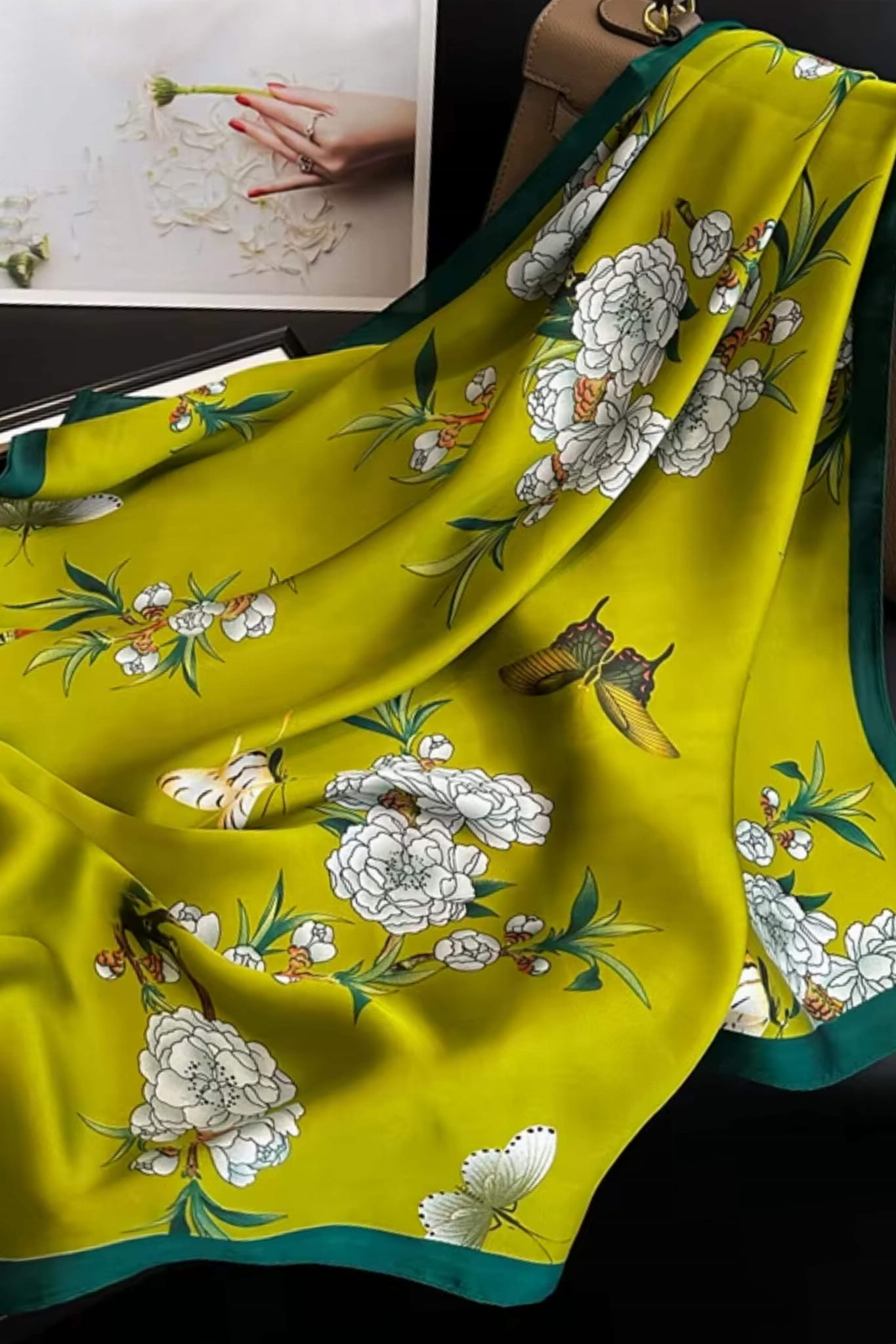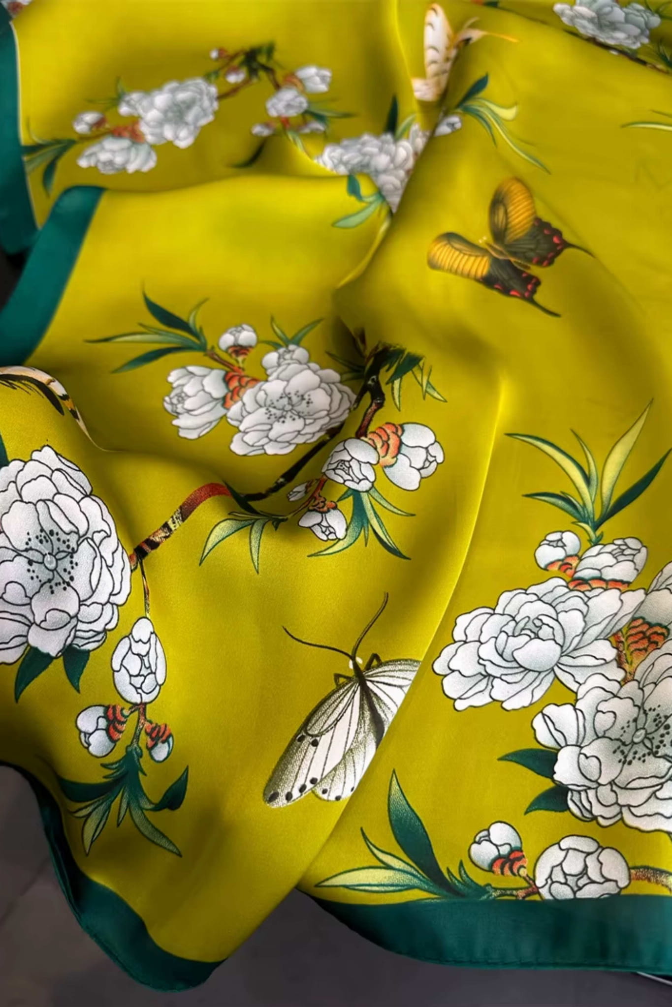 Satynowa apaszka 70x70 cm z motywem piwonii i motyli na limonkowym tle – lekka, kwiatowa elegancja z nutą orientu.