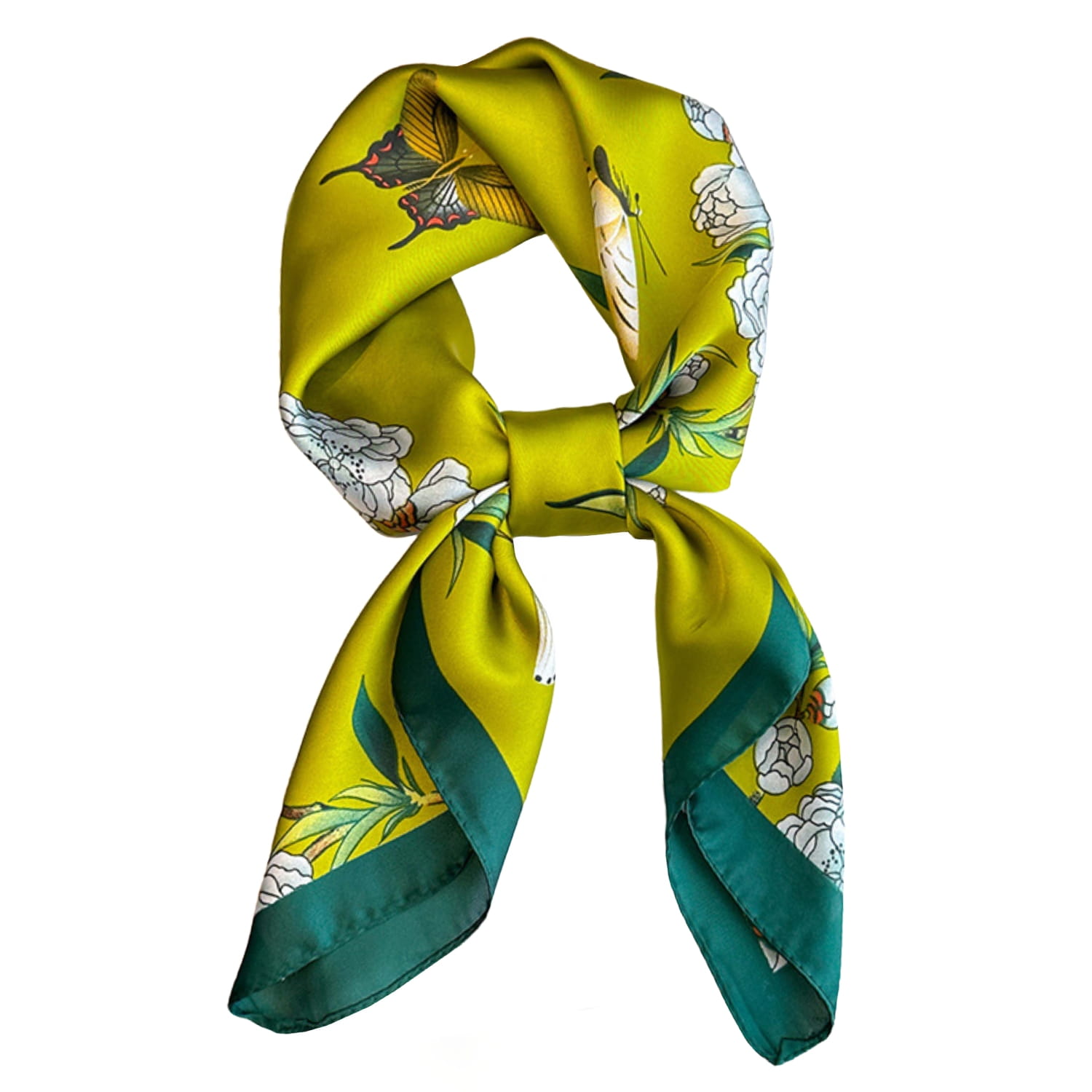 Satynowa apaszka damska 70x70 cm – limonkowa z piwoniami i motylami, w stylu ogrodu orientalnego