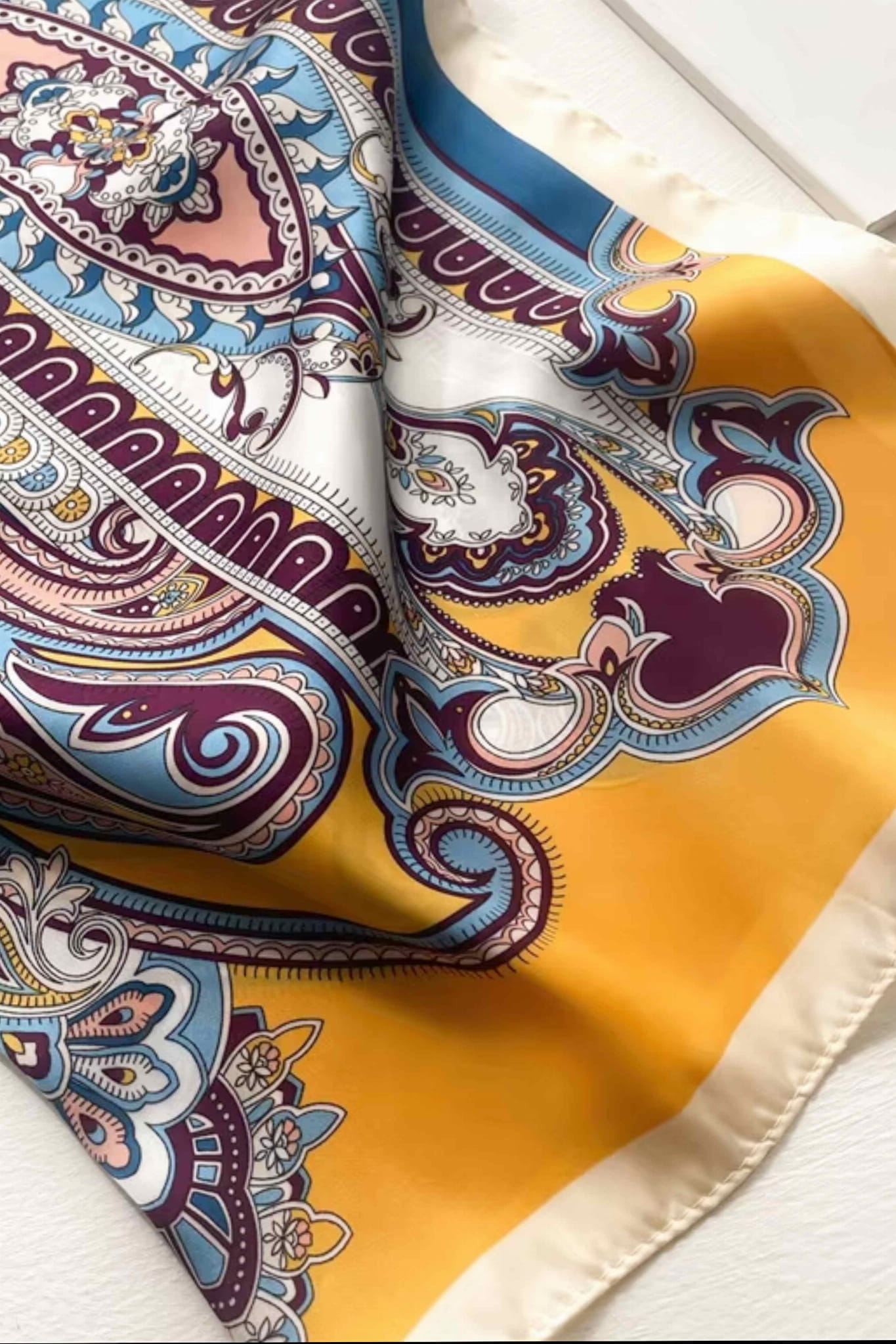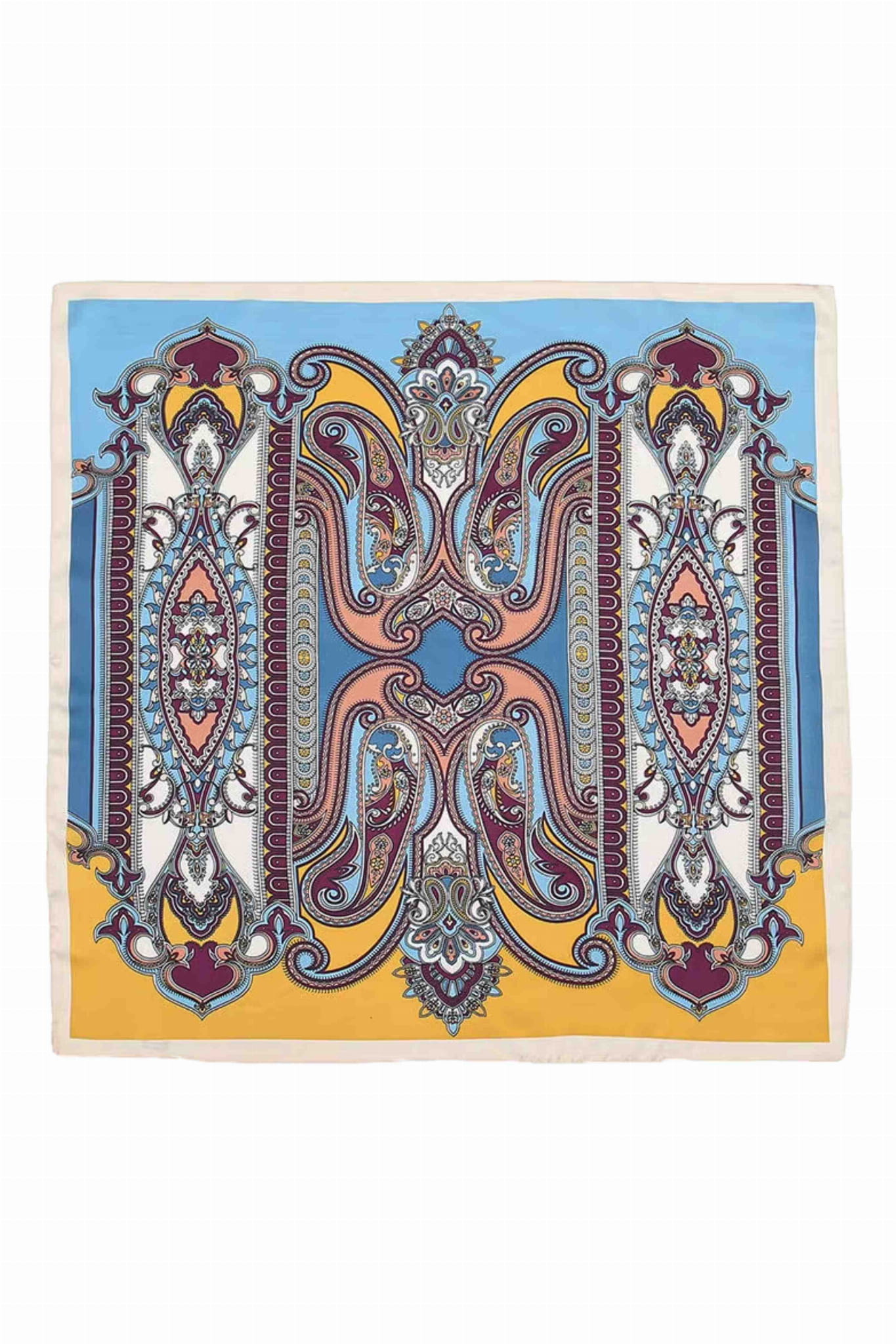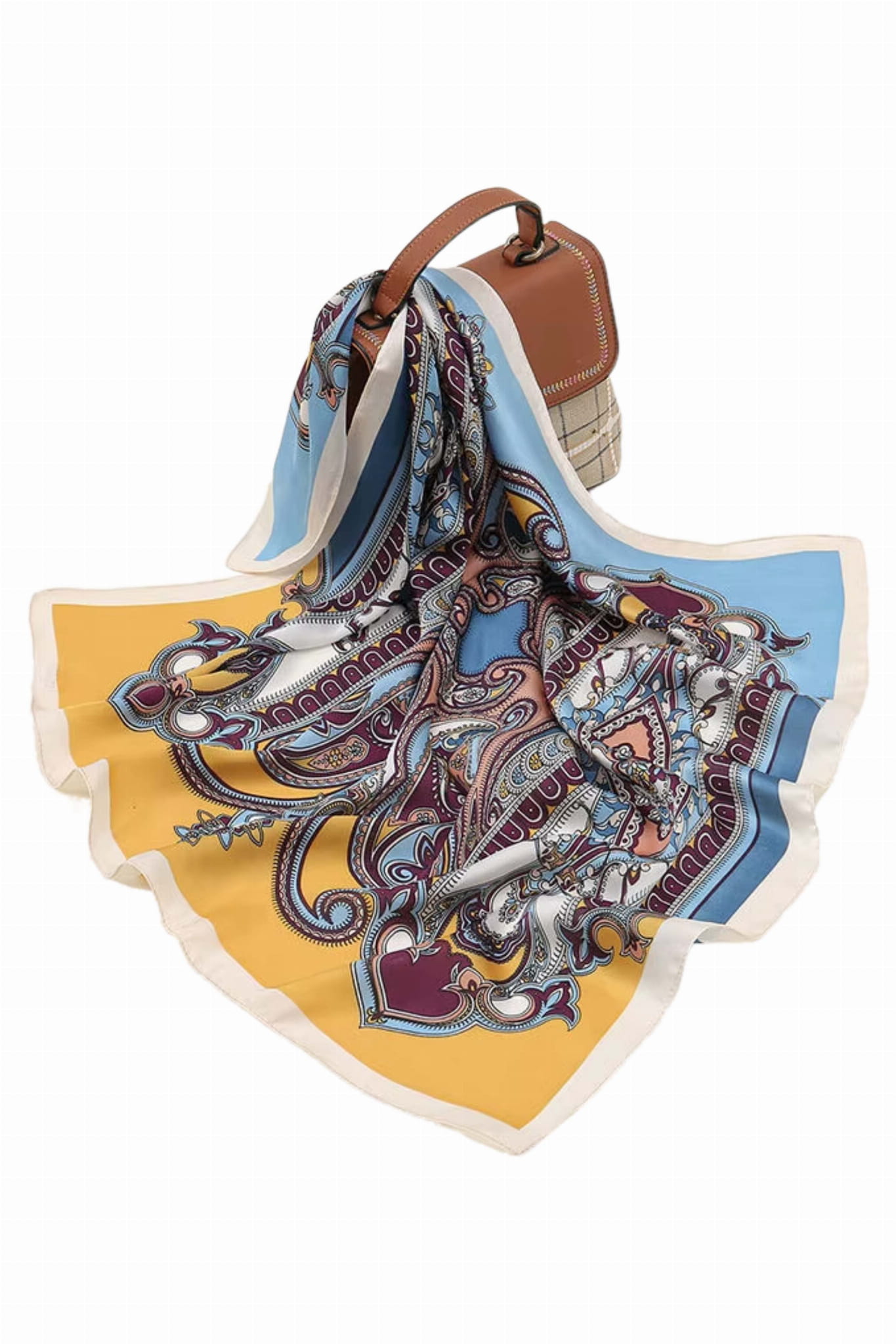 Satynowa apaszka 70x70 cm z orientalnym wzorem paisley w odcieniach błękitu, burgundu i żółci – bogata, elegancka i artystyczna.