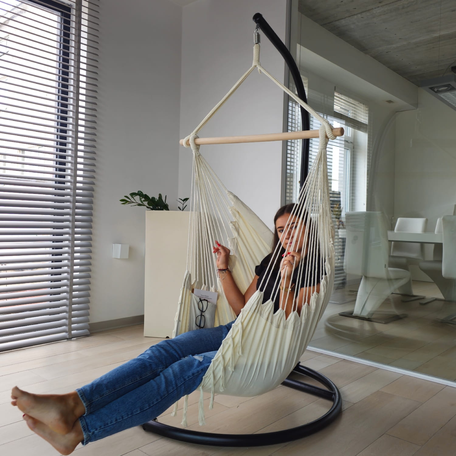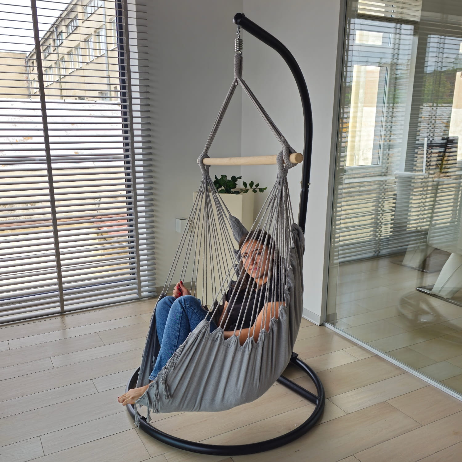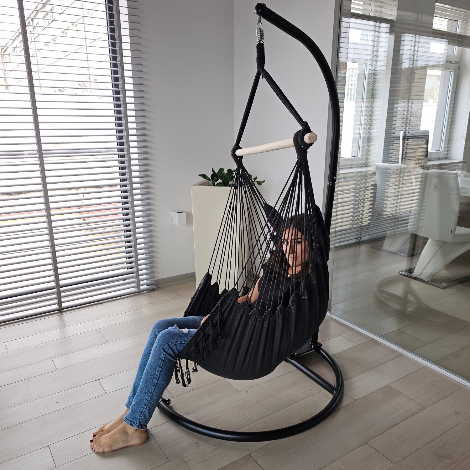Uniwersalny stojak do krzeseł wiszących to idealne rozwiązanie dla osób, które chcą cieszyć się relaksem bez konieczności wiercenia czy montowania haków w suficie. Konstrukcja pasuje do większości dostępnych na rynku fotelów wiszących, kokonów, huśtawek czy krzeseł hamakowych – zarówno do użytku w ogrodzie, jak i na tarasie, balkonie czy w domu.
