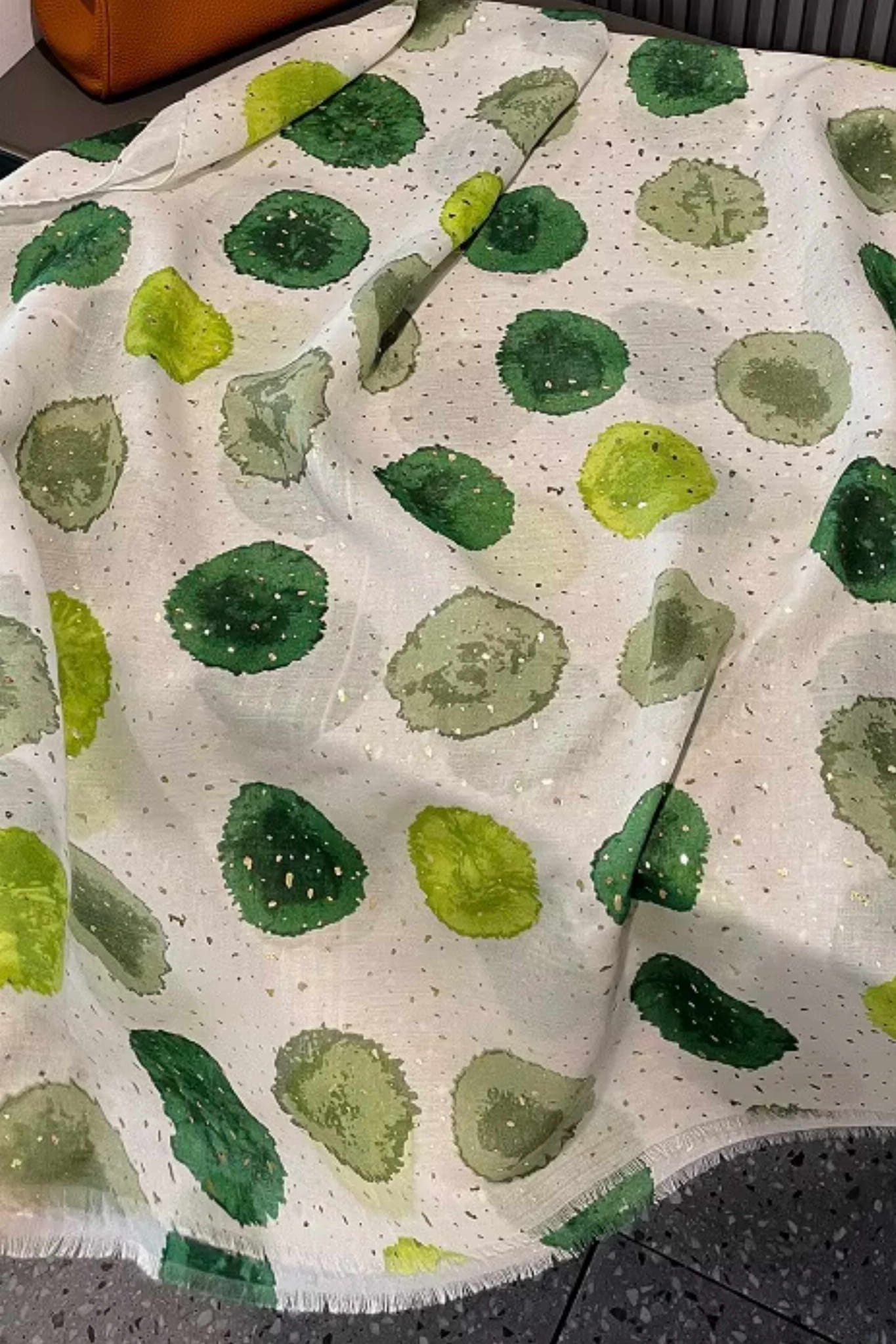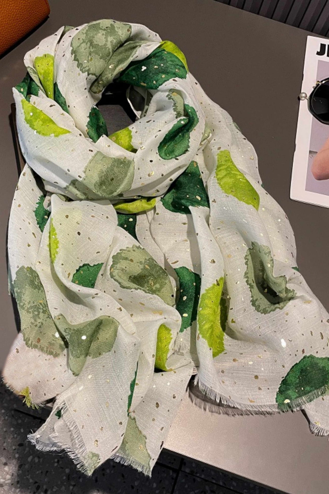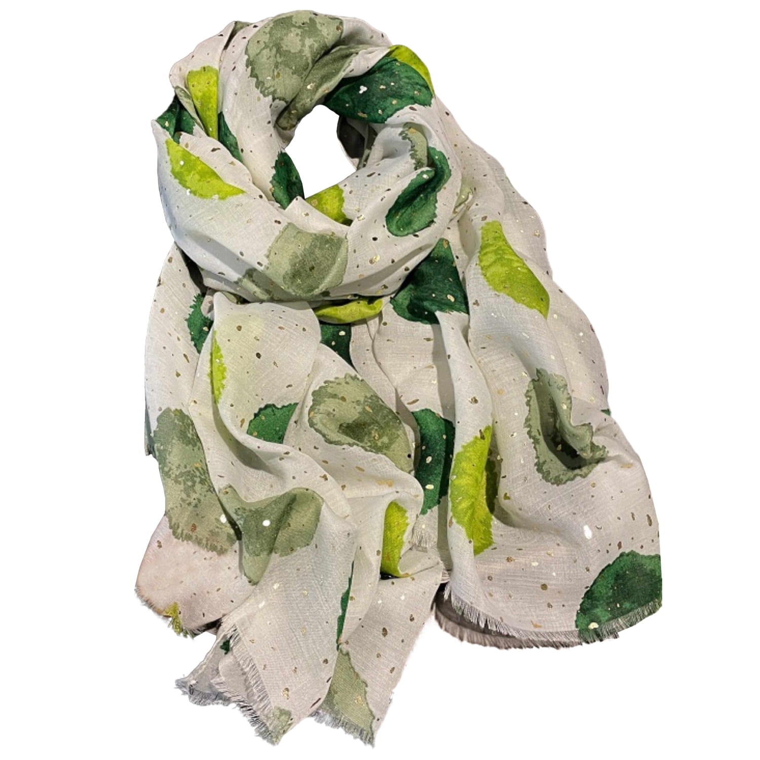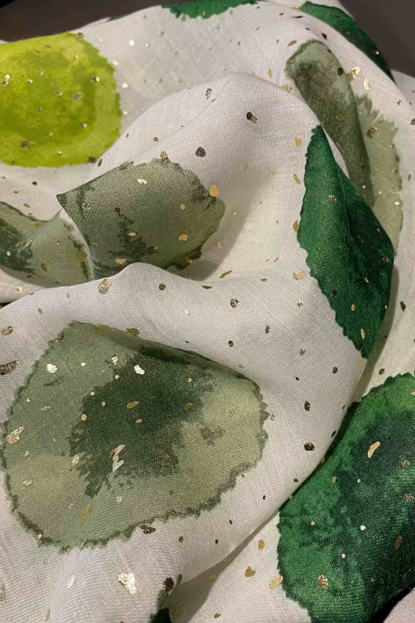 Ten modny szal to połączenie naturalnych barw i delikatnego połysku, który dodaje elegancji. Jasne tło z artystycznymi zielonymi plamami i złotymi drobinkami tworzy stylowy, lekki dodatek do wielu stylizacji.