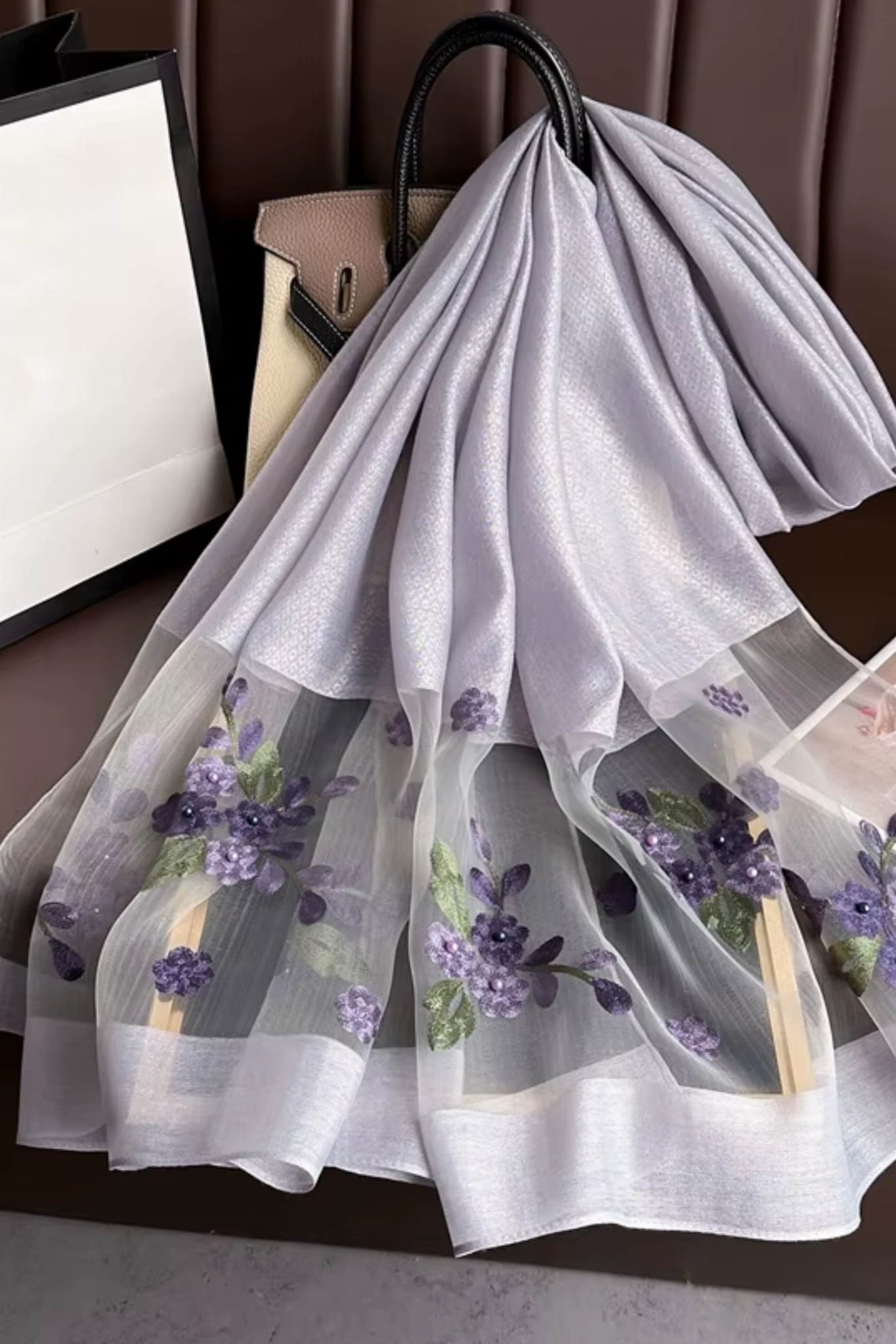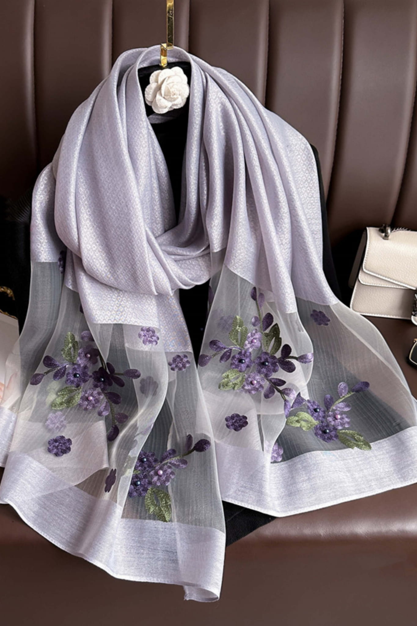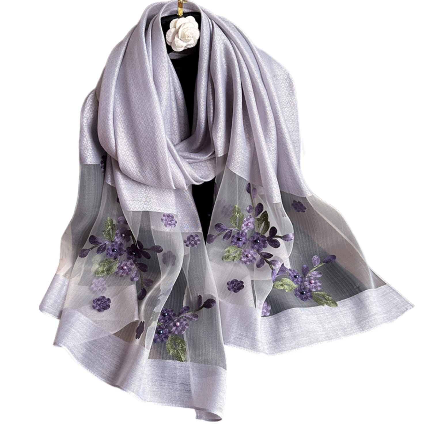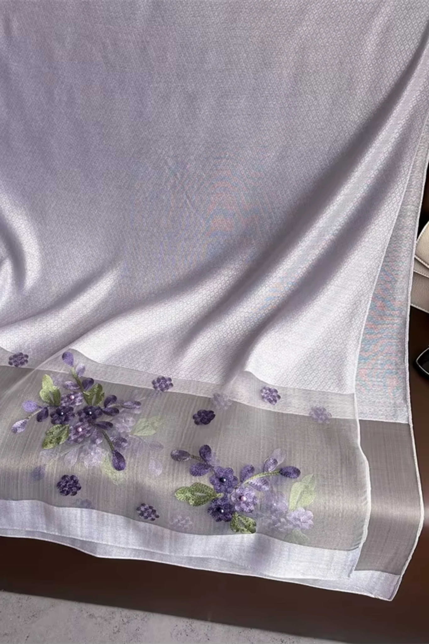 Ten szal w kolorze subtelnej lawendy zachwyca swoją elegancją i lekkością. Dolna część została ozdobiona przezroczystym materiałem z haftem kwiatowym w odcieniach fioletu i zieleni, co nadaje całości wyrafinowanego charakteru.