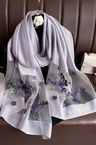 Szal lawendowy z haftowanymi kwiatami 180x70 cm – jedwab z poliestrem