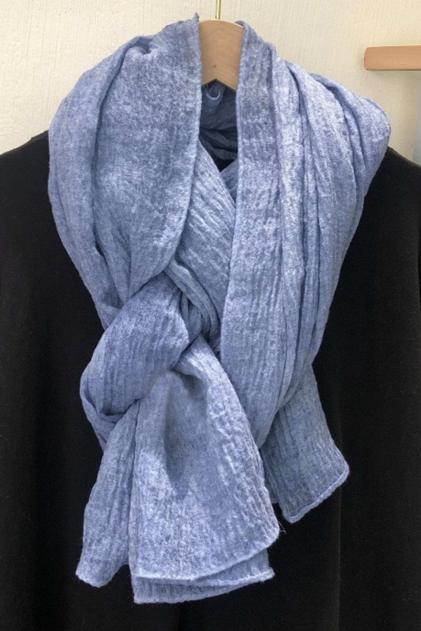 Niebieski szal z delikatną tłoczoną fakturą. Skład: 80% bawełna, 20% poliester. Wymiary: 180x90 cm.