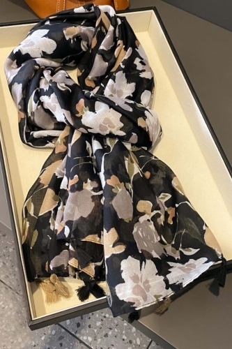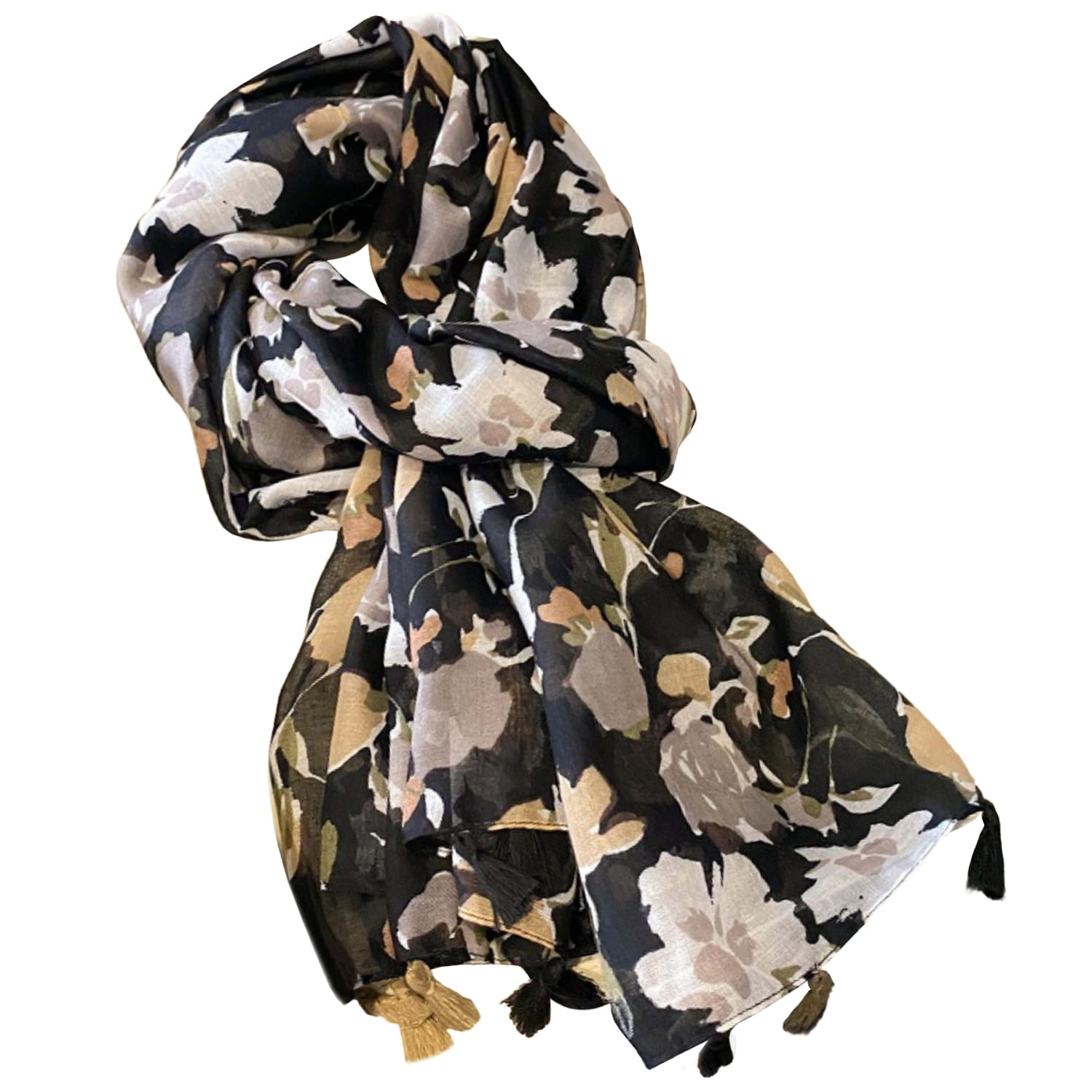 Szal w kwiatowy wzór z frędzlami, beżowo-czarny 180x90 cm
