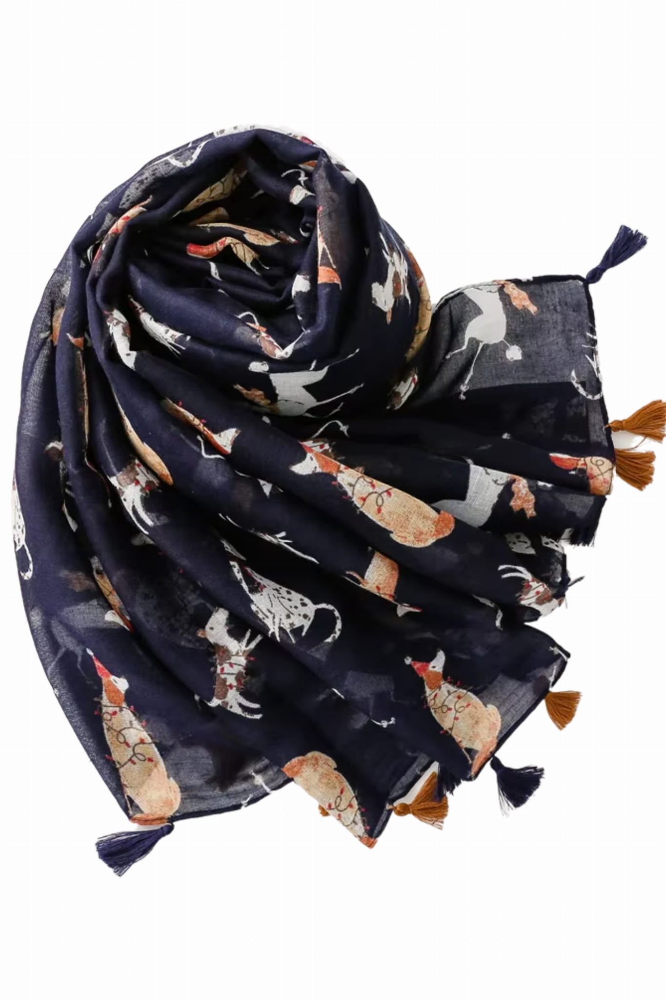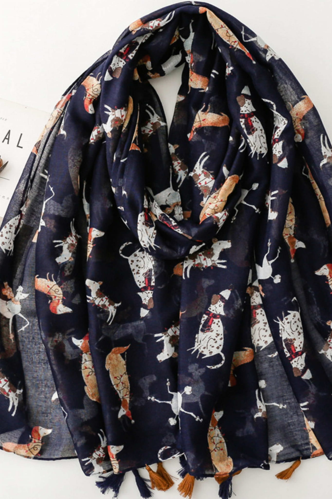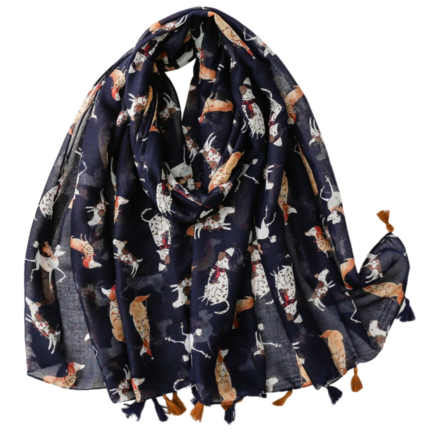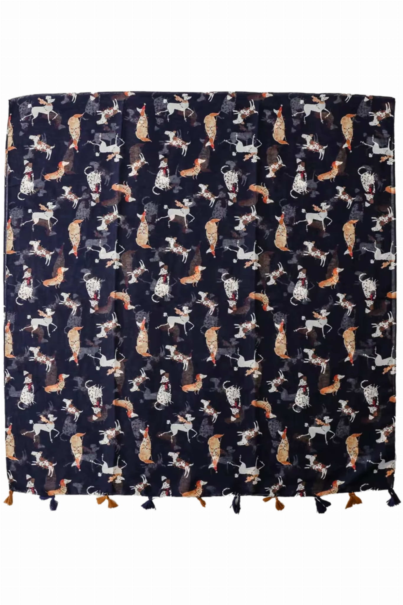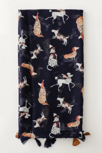 Stylowy szal z motywem różnych ras psów na tle w kolorze granatowym. Zakończony ozdobnymi chwostami. Wymiary 180x90 cm.