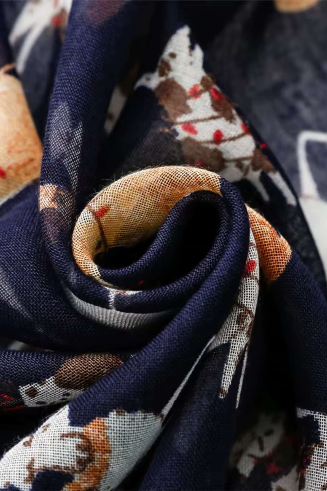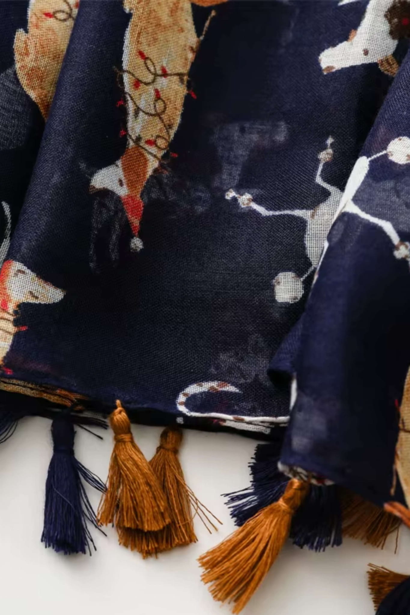 Wykończony ozdobnymi chwostami w kolorze granatowym i karmelowym, szal świetnie sprawdzi się zarówno w codziennych stylizacjach, jak i jako lekki dodatek na spacer czy do pracy. Materiał jest miękki, przewiewny i przyjemny w dotyku.