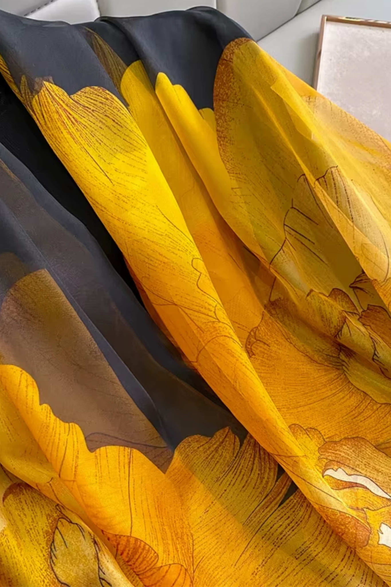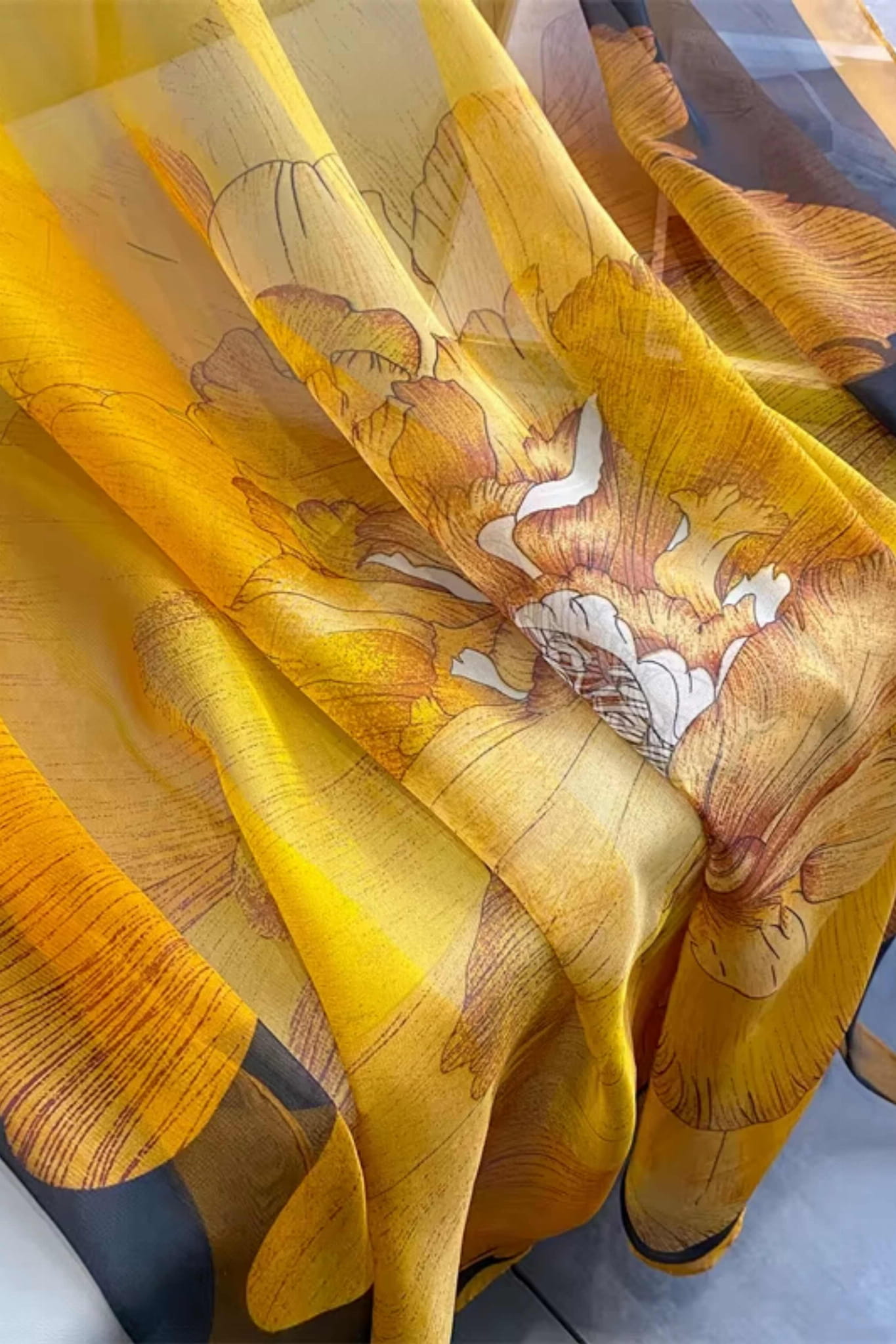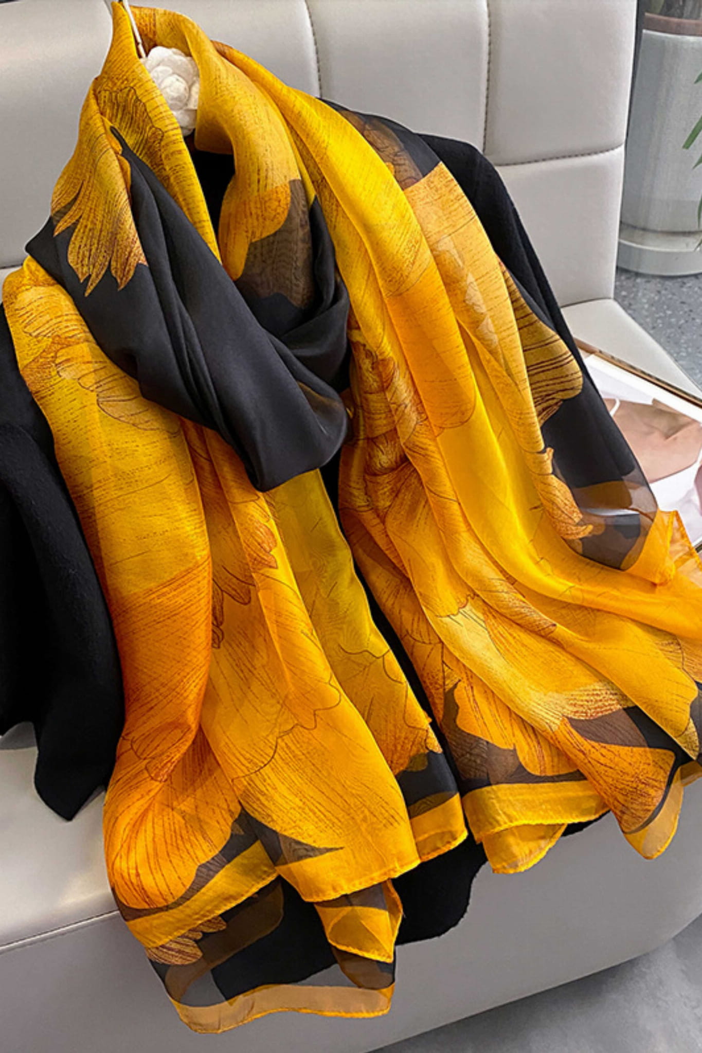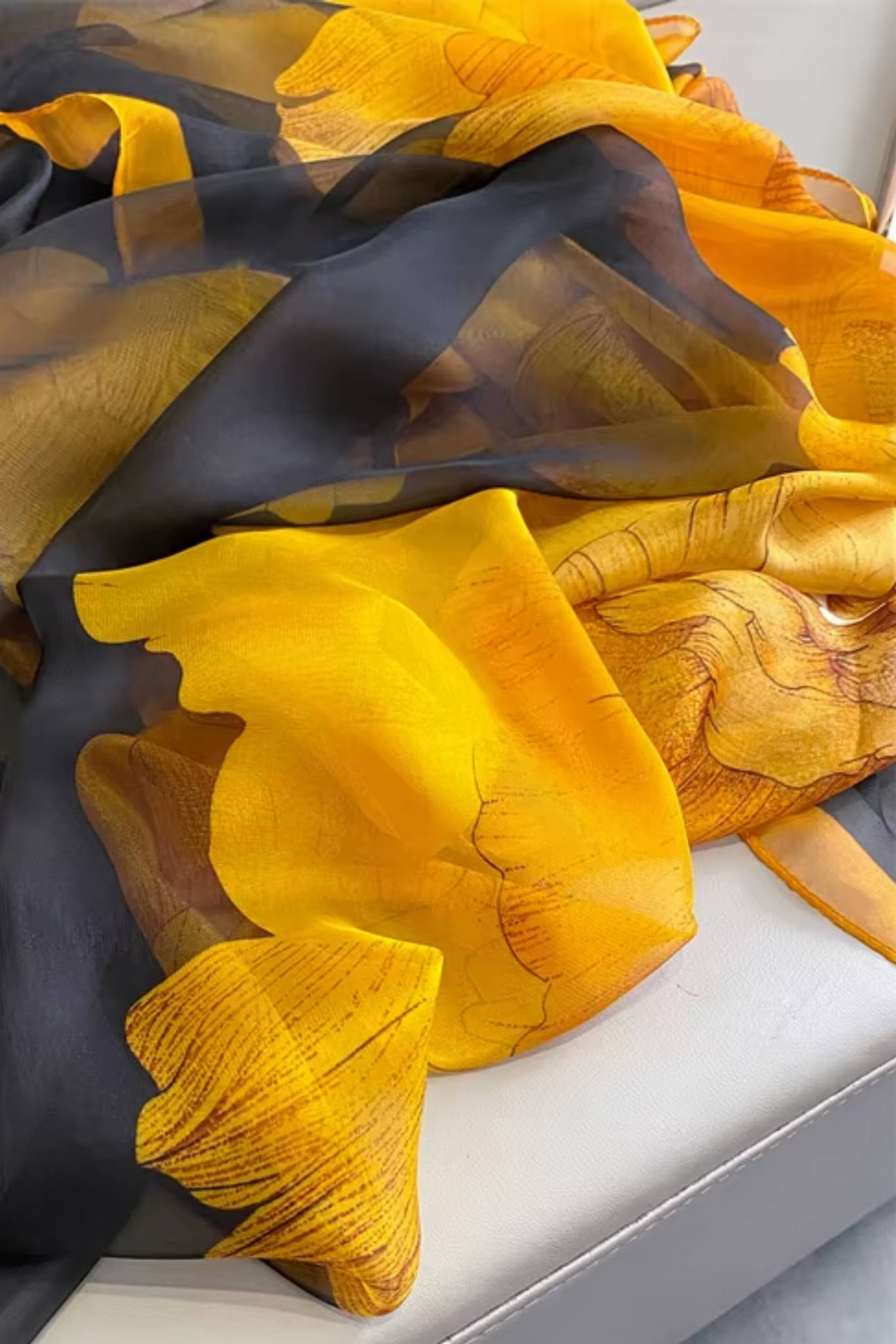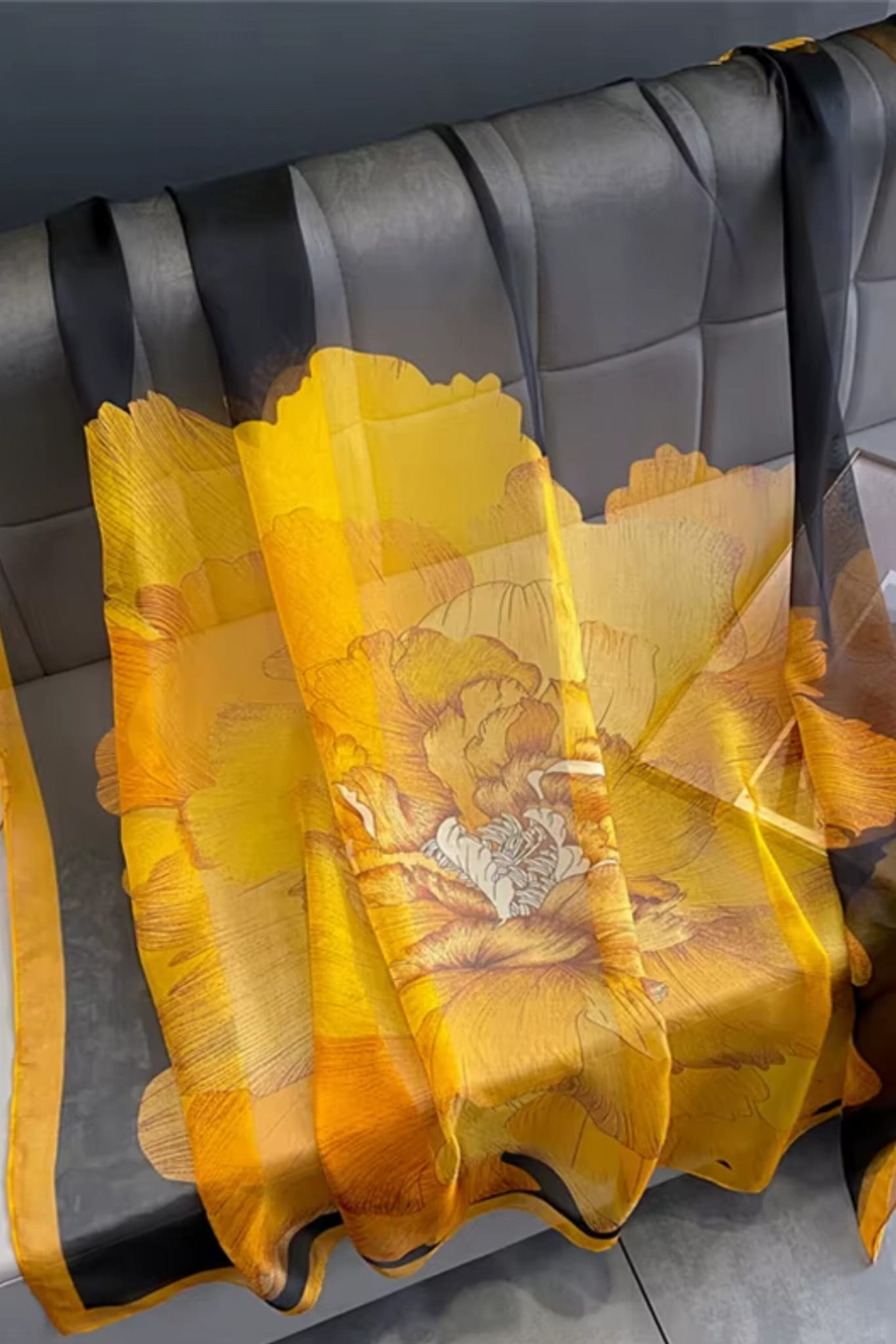Elegancki szal z efektem jedwabiu, ozdobiony dużym kwiatowym motywem w odcieniach żółci i czerni. Idealny do codziennych i wieczorowych stylizacji.