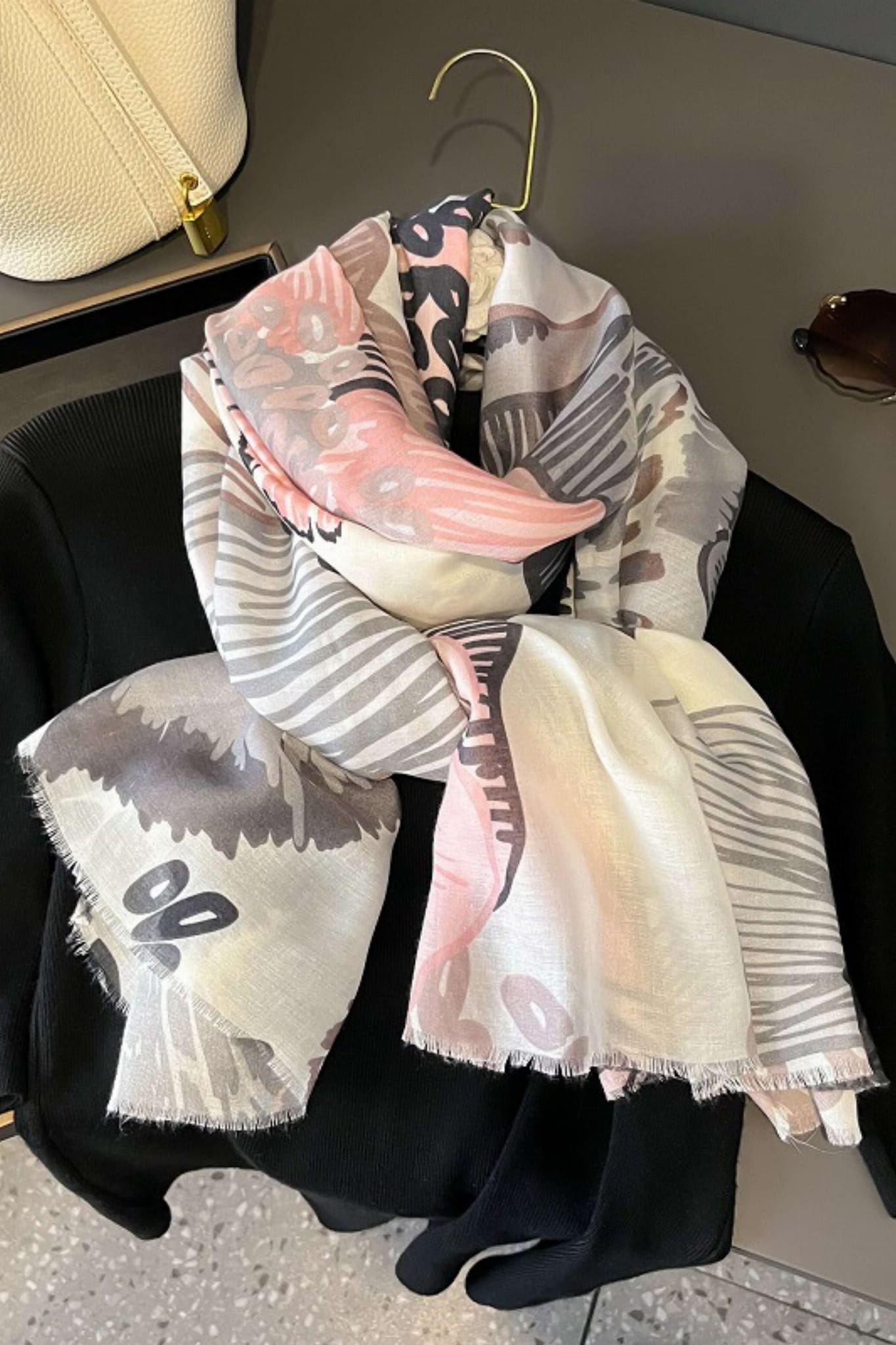 Ten szal to połączenie subtelnej kolorystyki i artystycznego designu. Delikatne beże, szarości oraz akcenty pudrowego różu nadają mu ponadczasowy charakter, a geometryczno-abstrakcyjny nadruk dodaje nowoczesnego sznytu.