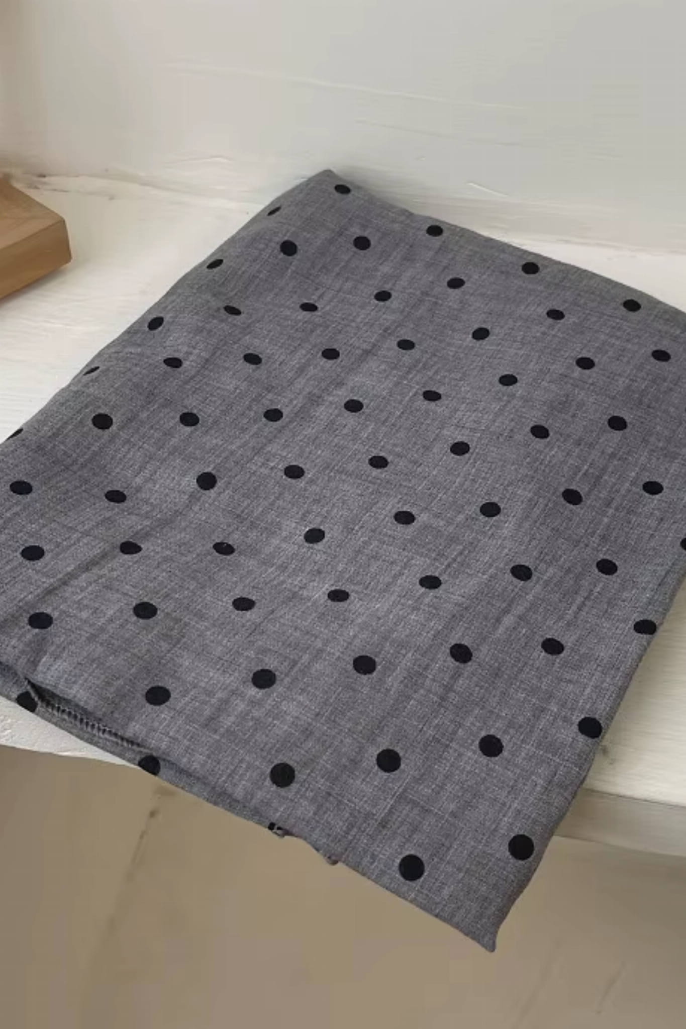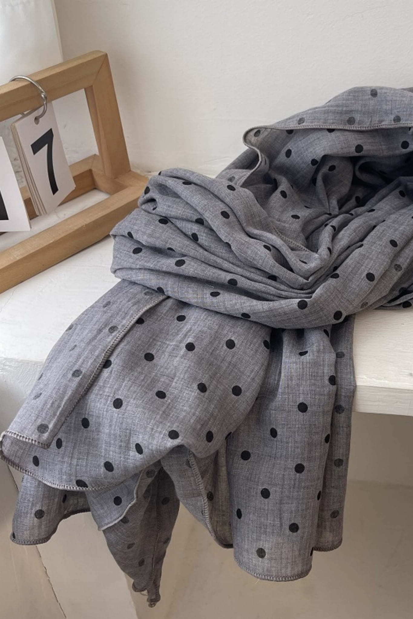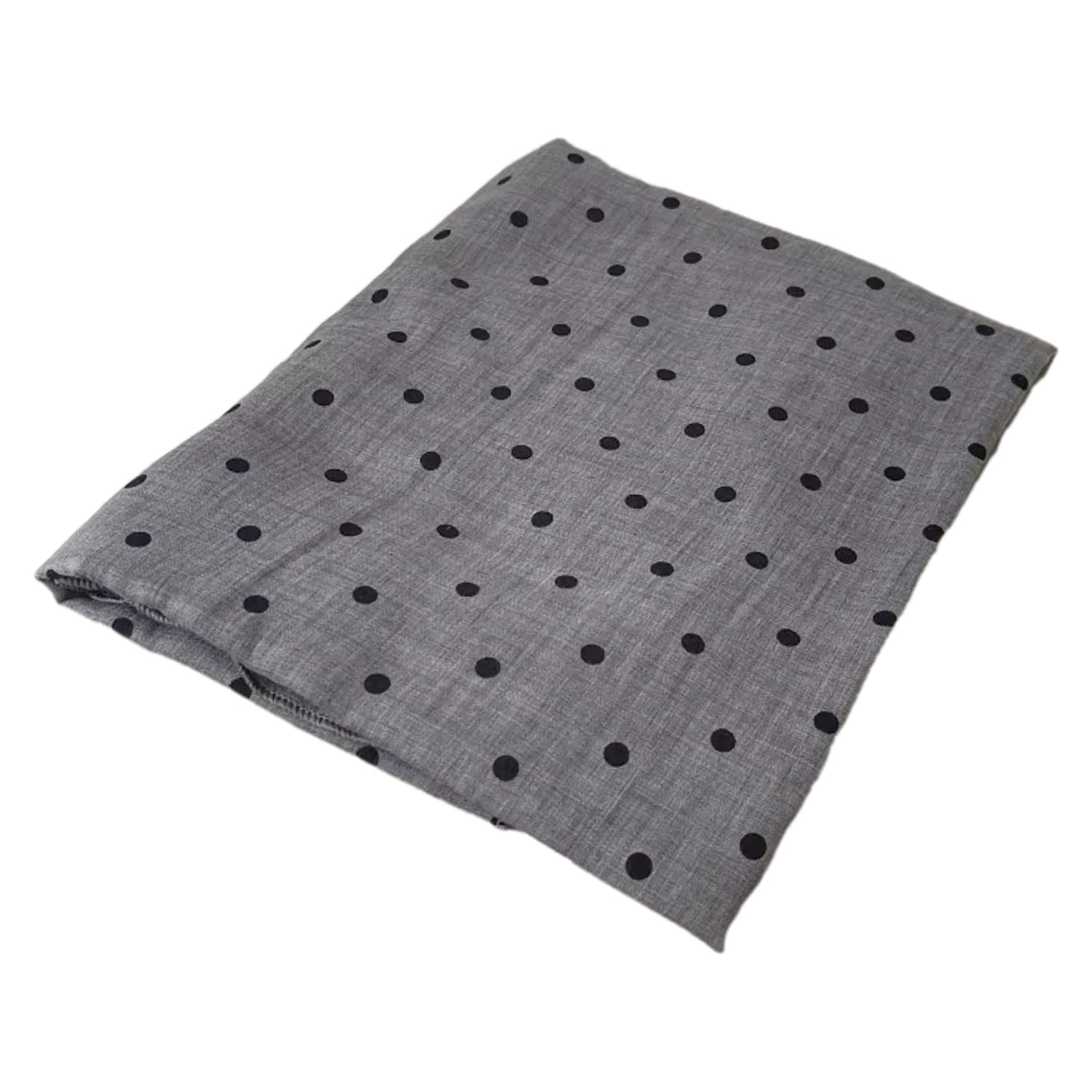 Szary szal w czarne kropki, lekki i miękki w dotyku. Wymiary 180x90 cm. Skład: 80% bawełna, 20% poliester.
