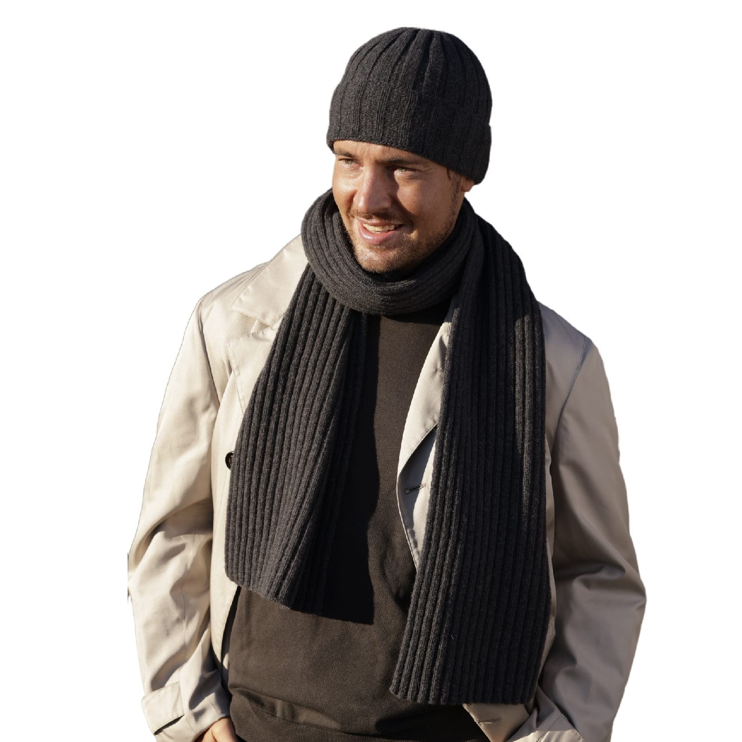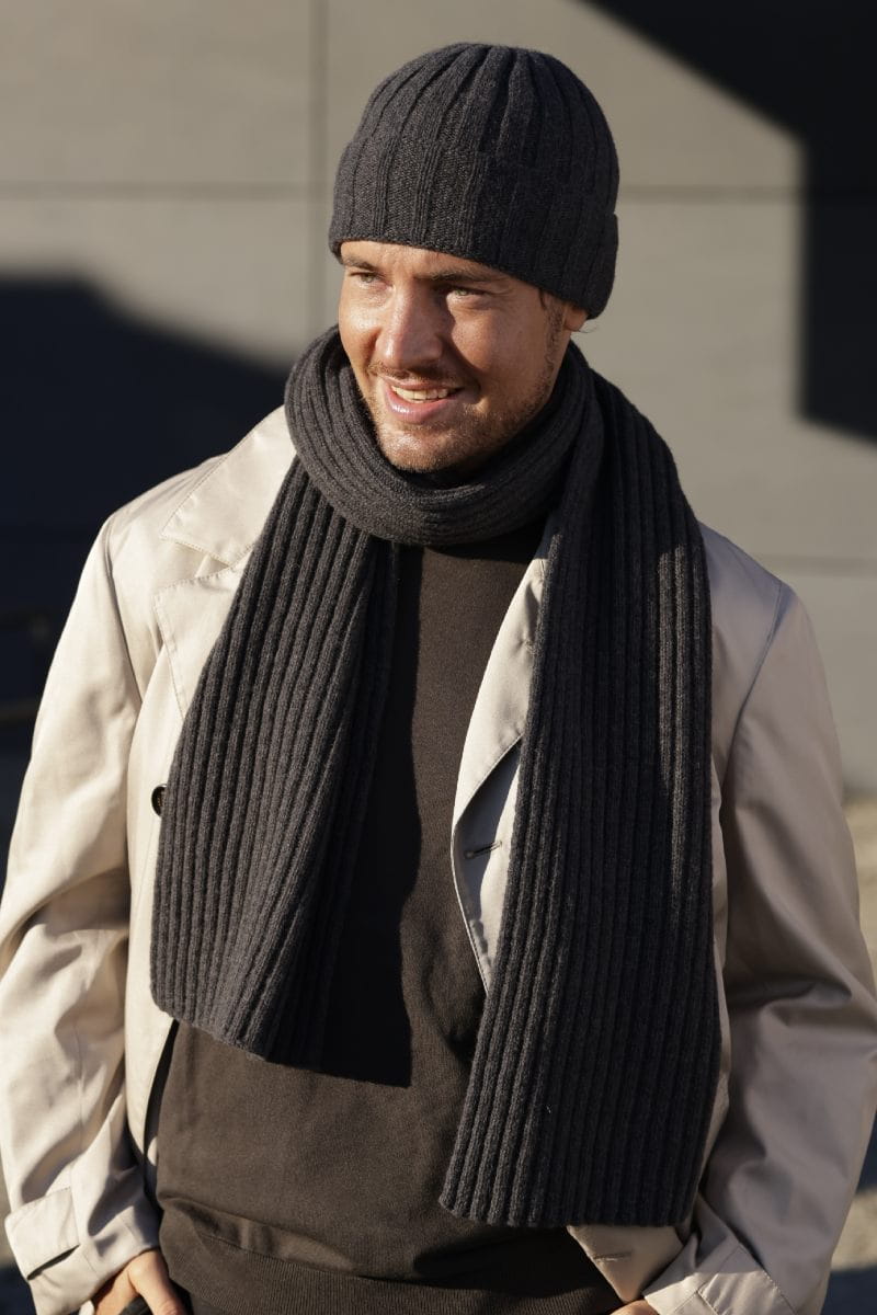 komplet męski czapka z mankietem i szalik; komplet wełniany męski; komplet grafitowy; komplet zimowy męski; prążkowany komplet; komplet męski grafit wełna; zestaw czapka i szalik 80% wełna PL; komplet-meski-trevor-grafit-czapka-z-mankietem-szalik