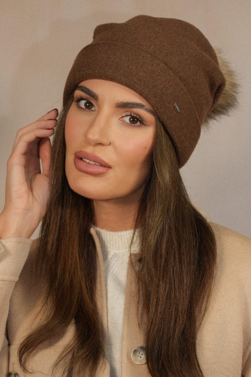 Wełniana Czapka Damska Z Naturalnym Pomponem Zimowa Kolor Tabacco Kamea-Chiru