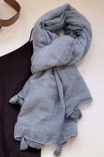 Stylowy szal w odcieniu zgaszonego błękitu z dekoracyjnymi frędzlami. Wymiary 180x90 cm. Skład: 80% bawełna, 20% poliester.
