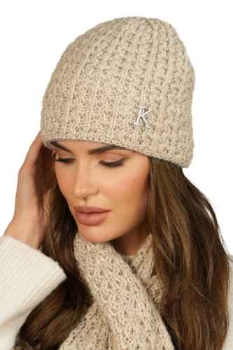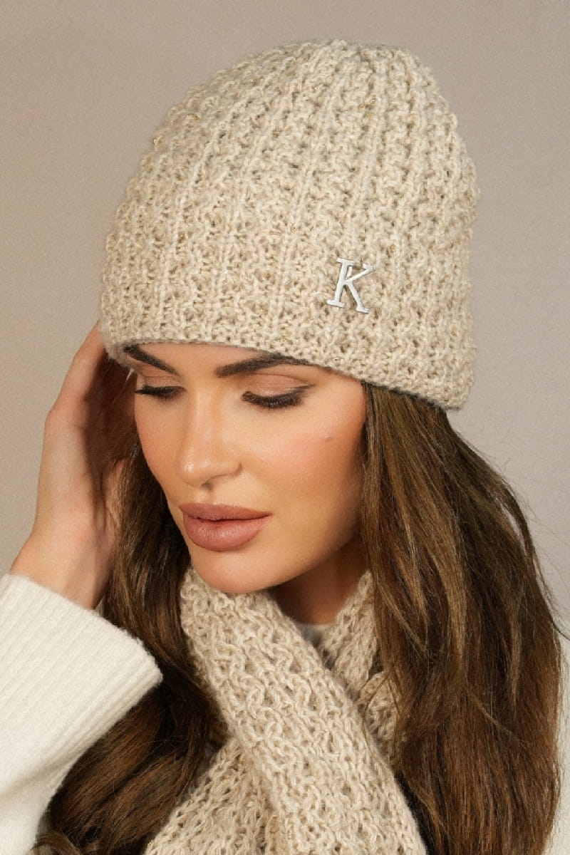 Zimowa Czapka Z Lurexem Ozdoobiona Literką "K" Kolor Beżowy Kamea-Kosmos