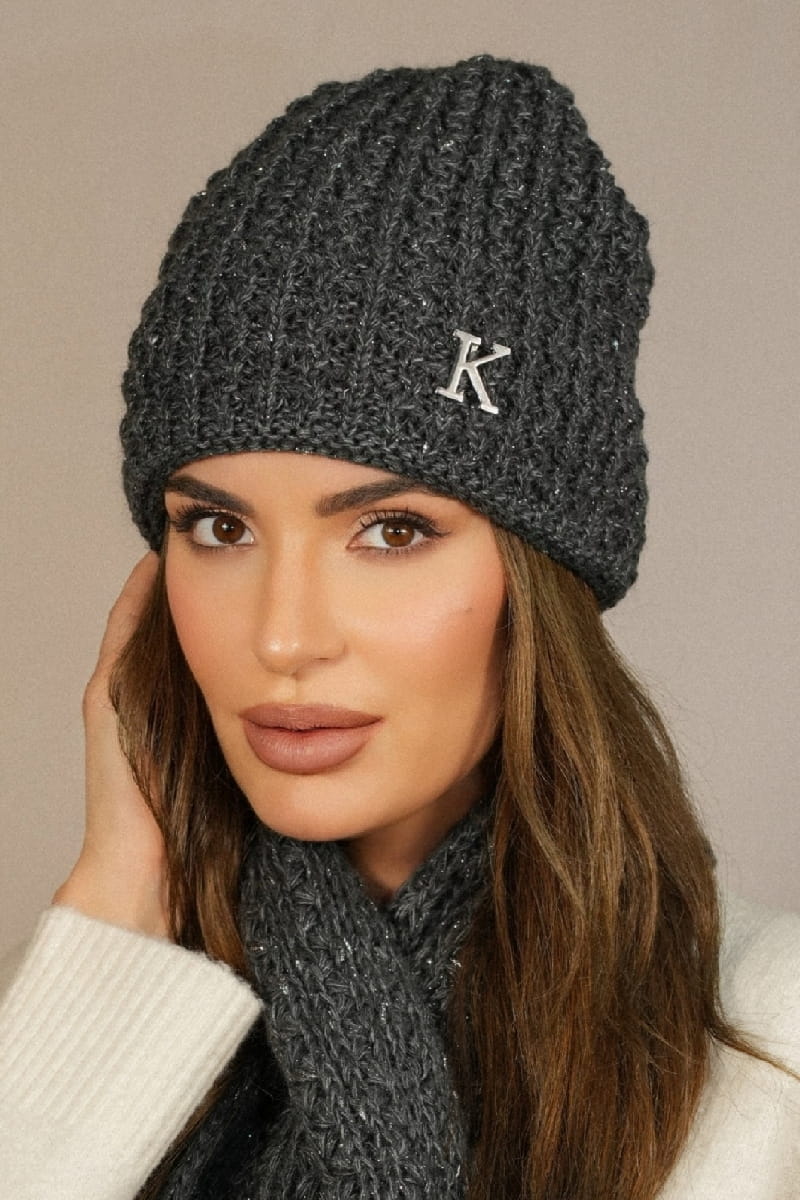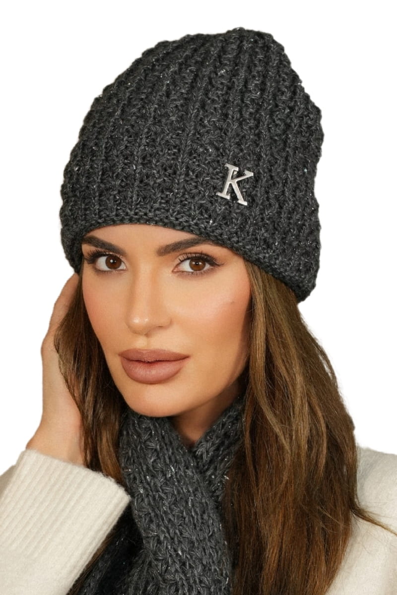 Zimowa Czapka Z Lurexem Ozdoobiona Literką "K" Kolor Ciemny Szary Kamea-Kosmos