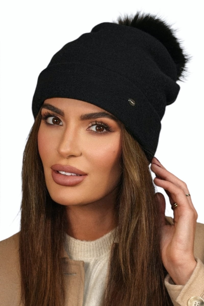 Zimowa Wełniana Czapka Damska Kolor Czarny Kamea-Chiru Pompon Naturalny