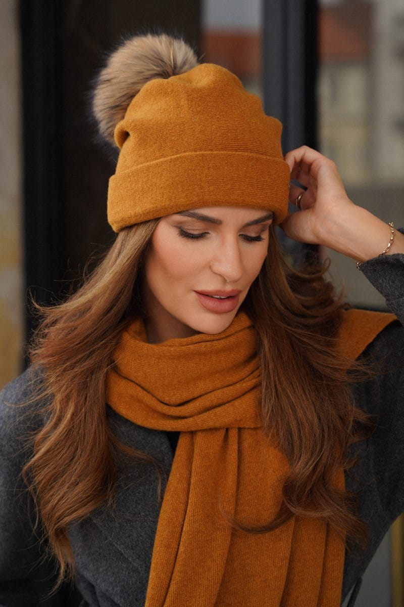 Wełniana Czapka Damska Z Naturalnym Pomponem Zimowa Kolor Tabacco Kamea-Chiru