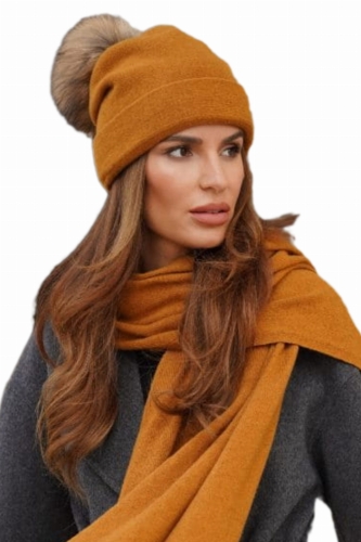 Zimowa Wełniana Czapka Damska Kolor Musztardowy Kamea-Chiru Pompon Naturalny