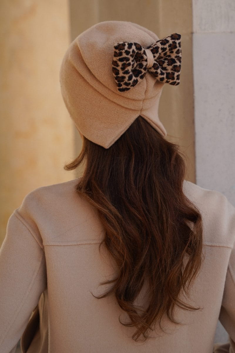 Zimowa Wełniana Czapka Z Kokardą W Panterkę Kolor Camel Kamea-Kiku