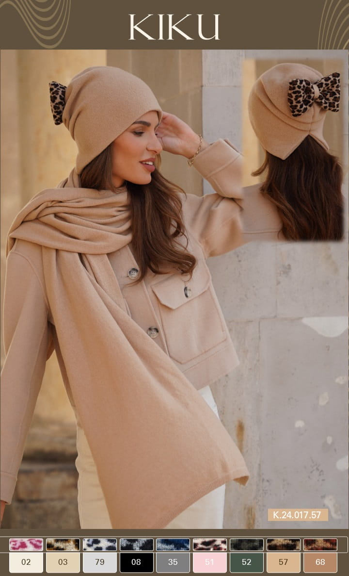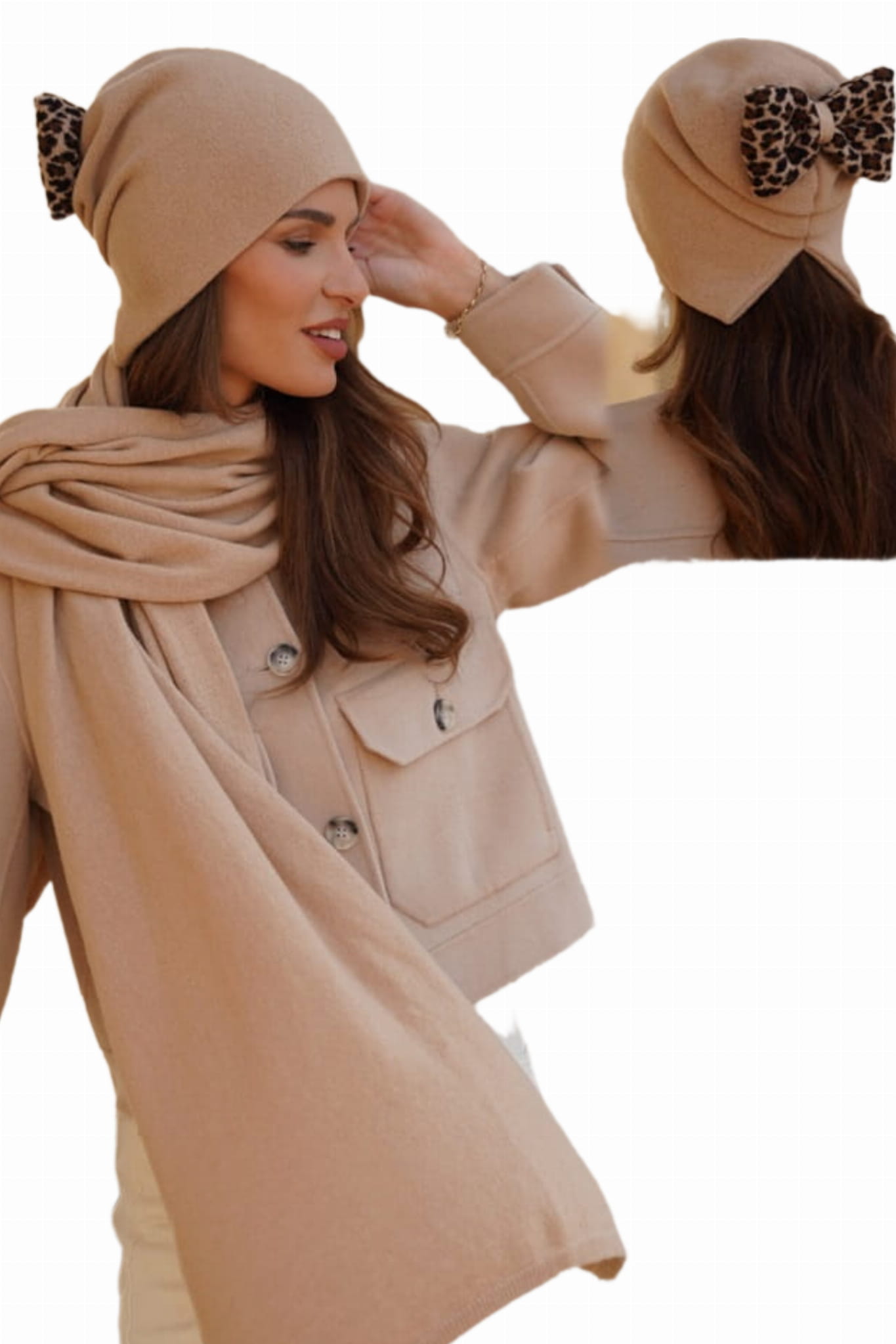 Zimowa Wełniana Czapka Z Kokardą W Panterkę Kolor Beżowy Kamea-Kiku