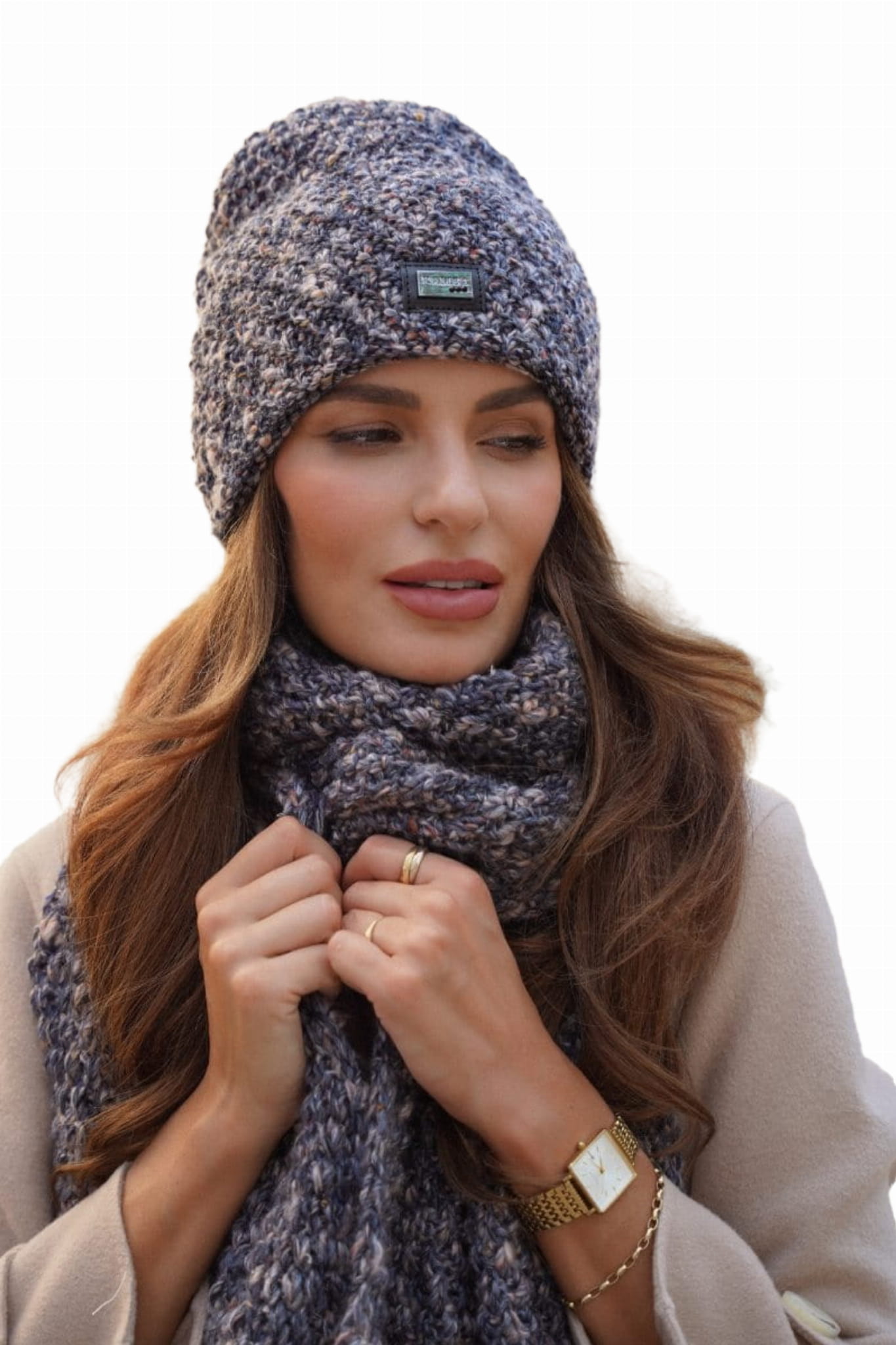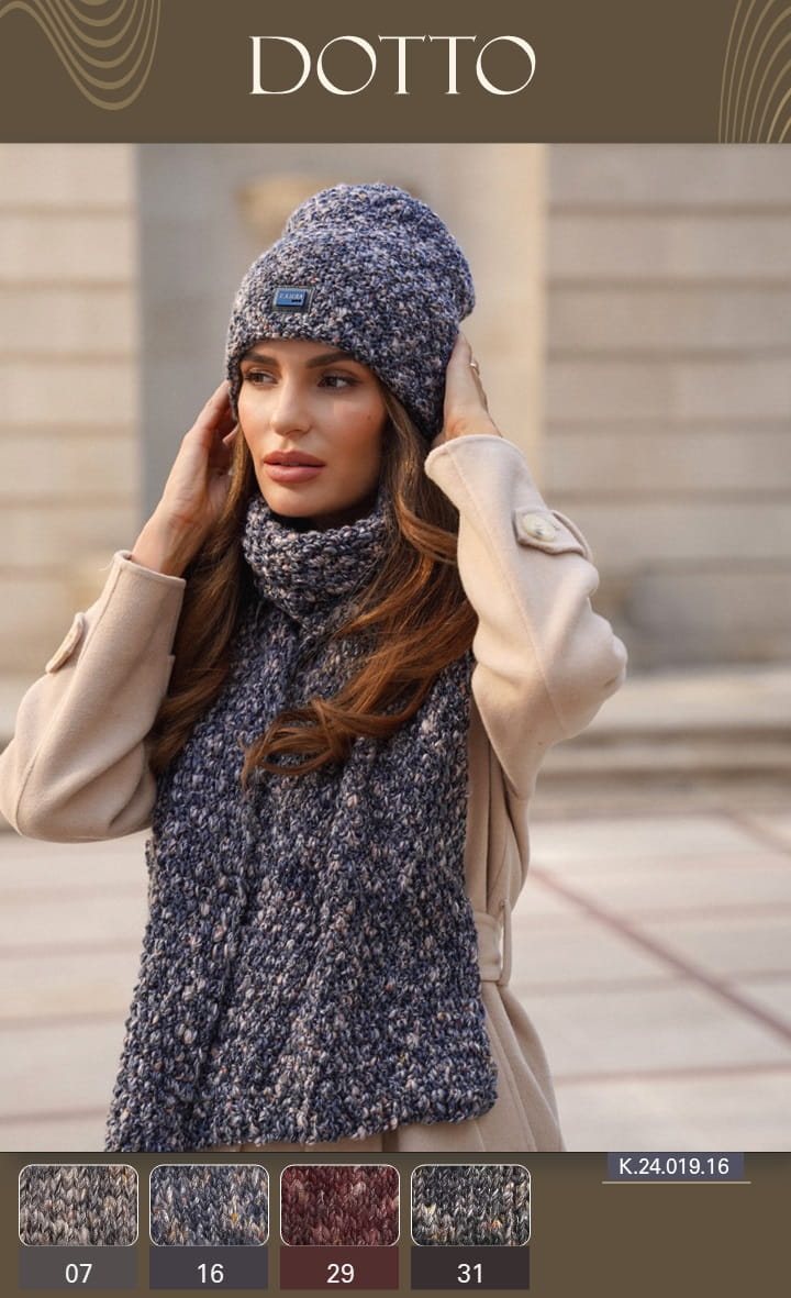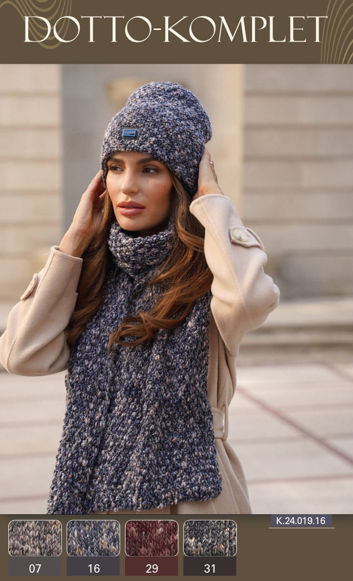 Komplet "Dotto" to elegancki i stylowy model wykonany z wysokiej jakości wielobarwnej przędzy o składzie: 46% poliakryl, 20% wełna, 17% wiskoza, 17% poliester.