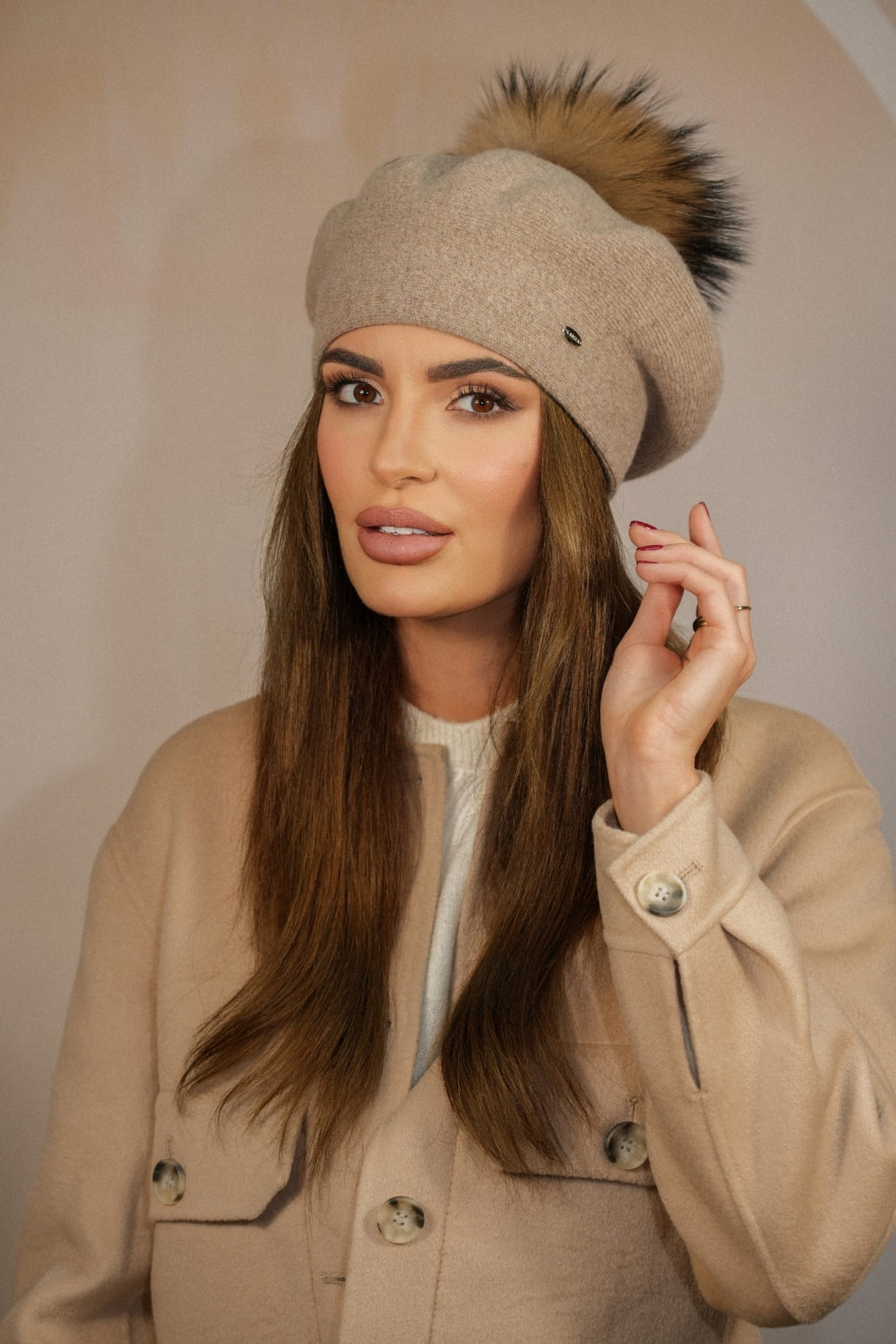 - Ekologicznym pomponem, który imituję futro jenota, harmonijnie dopasowanym do koloru beretu.