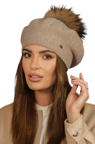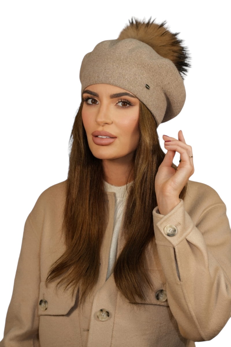 Zimowy Wełniany Beret Damski Z Pomponem Eco Kolor Ciemny Beżowy Kamea-Fuji